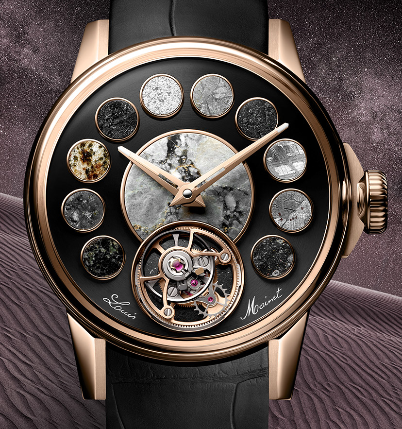Louis Moinet Cosmopolis là một trong những mẫu đồng hồ độc đáo nhất khi sử dụng tới 12 loại thiên thạch khác nhau trên cùng một mặt số. Mỗi mảnh vật liệu được đặt trong khung vàng hồng 18K, tạo thành bố cục đa lớp với độ phức tạp cao.