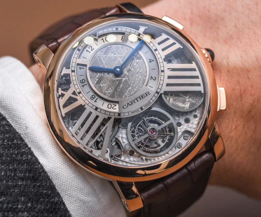 Cartier Rotonde de Cartier Earth & Moon thể hiện cách tiếp cận khác biệt khi tích hợp thiên thạch vào một cấu trúc cơ học phức tạp. Bộ máy calibre 9440 MC lên cót tay, tích hợp tourbillon và cơ chế hiển thị chu kỳ mặt trăng theo yêu cầu