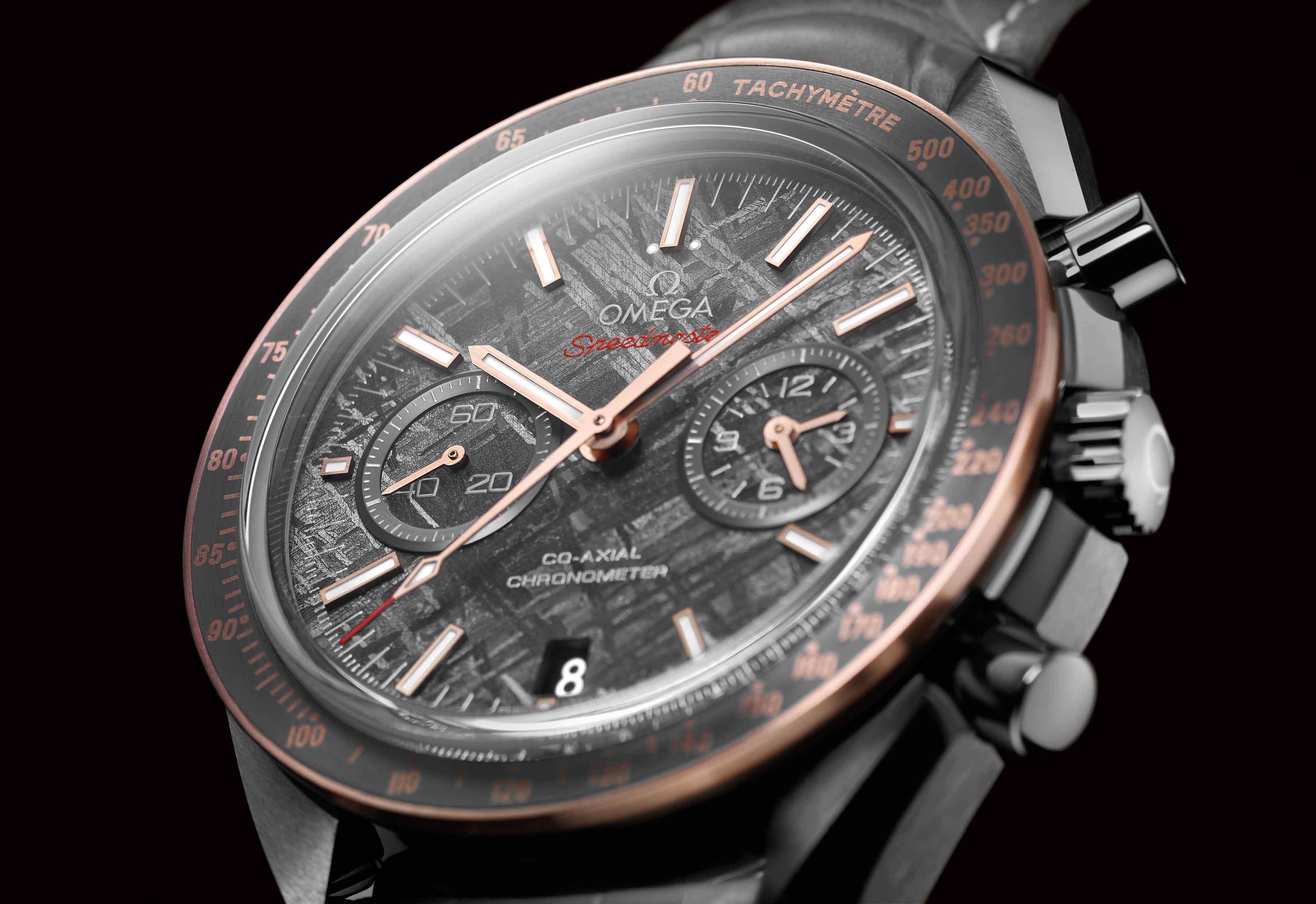 Omega tiếp cận mặt số thiên thạch theo hướng công nghệ cao với dòng Speedmaster Dark Side of the Moon Meteorite. Mẫu đồng hồ này sử dụng vỏ gốm nguyên khối kích thước 44,25mm, kết hợp với các chi tiết vàng Sedna 18K, tạo nên sự tương phản mạnh về vật liệu