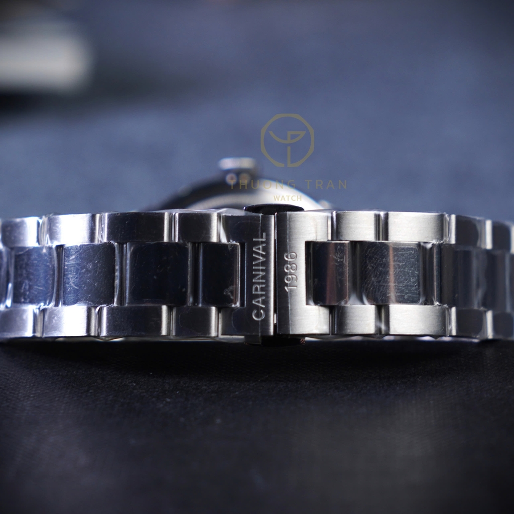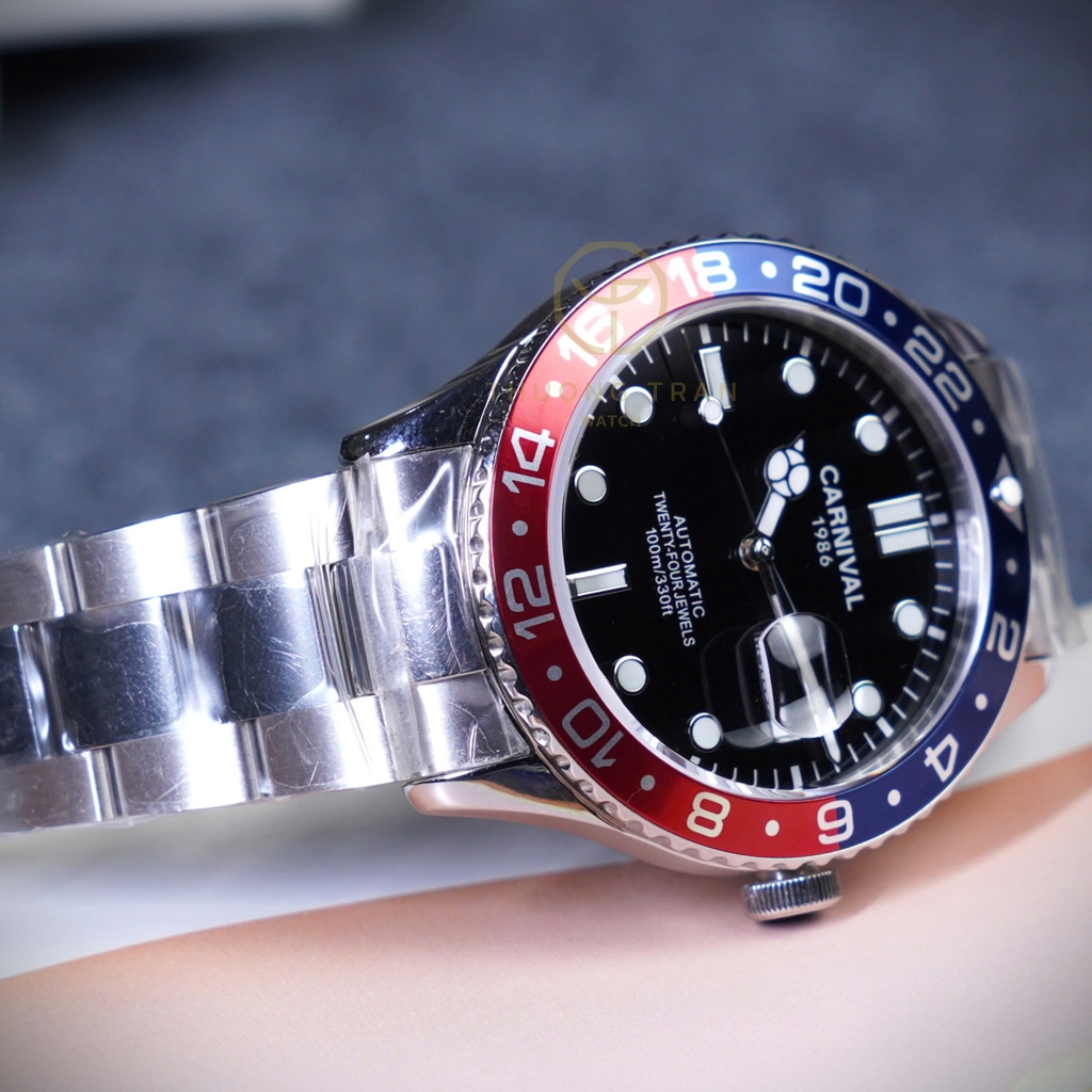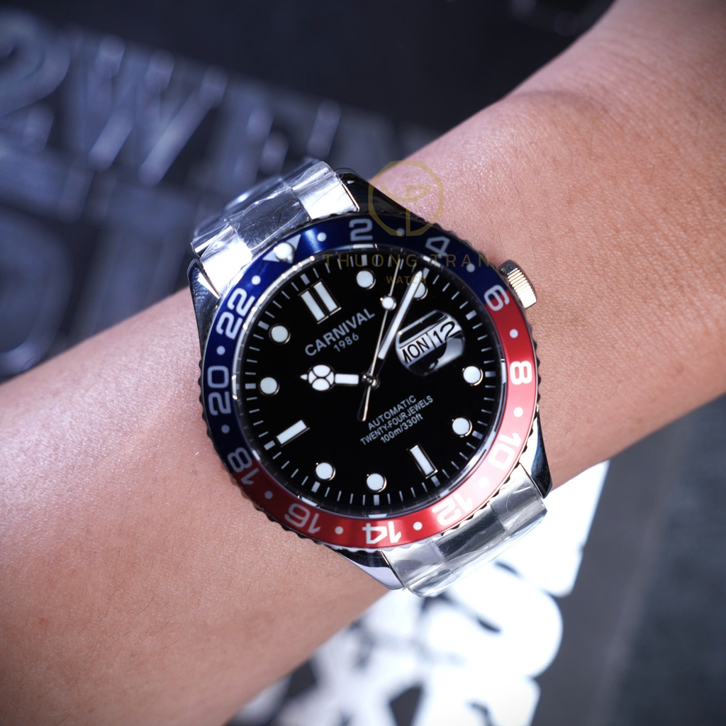 CARNIVAL 8152G-VT-D1 là một mẫu đồng hồ thể thao đầy phong cách và hiện đại. Được thiết kế với mặt số đen, các chỉ số giờ dạng hình tròn và hình chữ nhật lớn, dễ nhìn. Vành bezel của đồng hồ được thiết kế theo kiểu "Pepsi" với hai màu xanh và đỏ, thể hiện phong cách mạnh mẽ và thể thao. Đồng hồ có chức năng hiển thị thứ và ngày ở vị trí 3 giờ. Vỏ và dây đeo bằng kim loại sáng bóng, tạo cảm giác sang trọng và bền bỉ. Chất liệu thép không gỉ kết hợp với khả năng chống nước 10ATM, đây là một mẫu đồng hồ vừa thanh lịch vừa phù hợp cho các hoạt động ngoài trời.