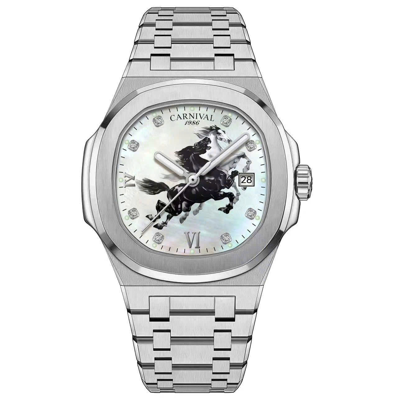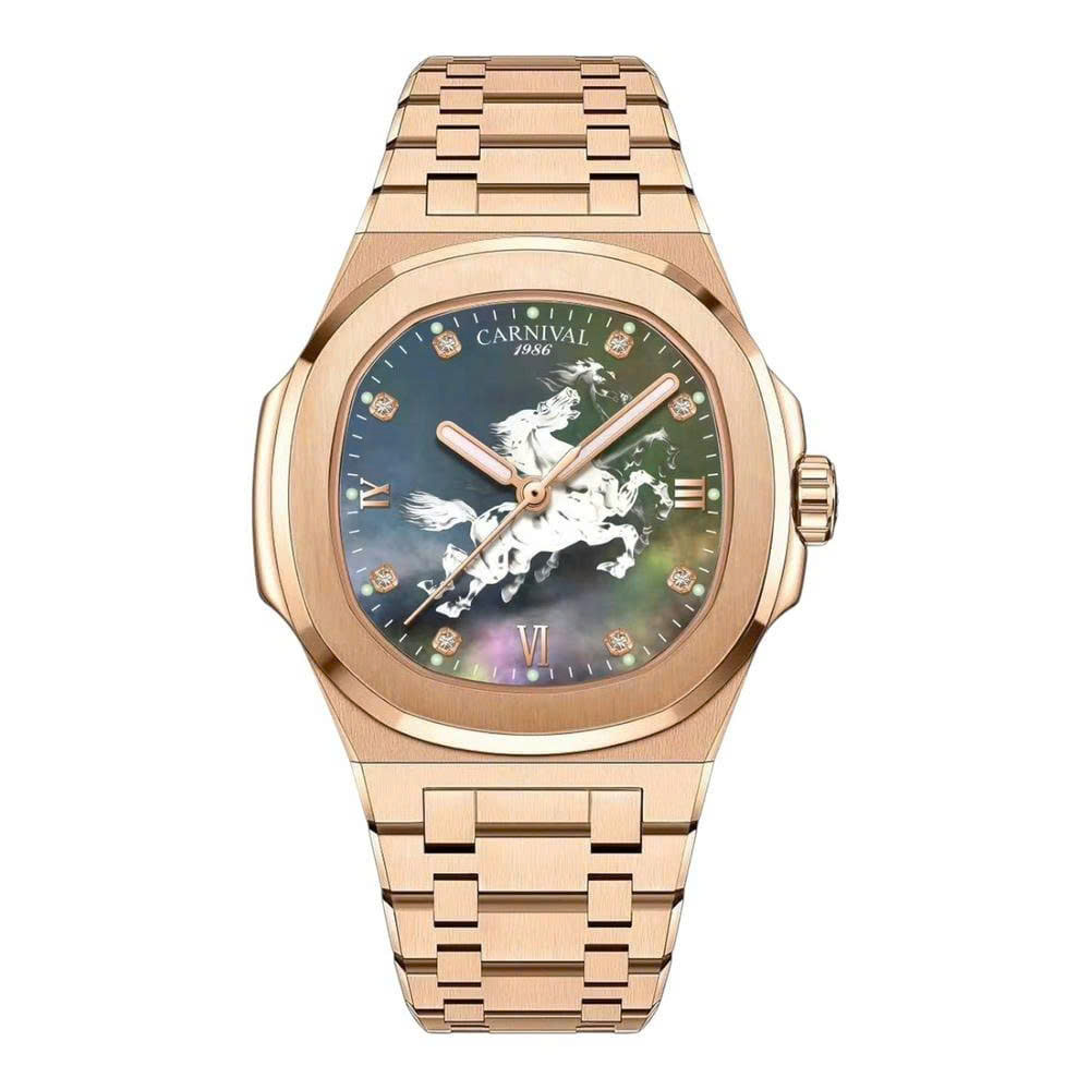 Điểm nhấn đắt giá nhất trên mặt số của Carnival 8160G chính là hình ảnh Song Mã (hai chú ngựa) đang tung vó tràn đầy sinh lực. Trong văn hóa phương Đông, hình tượng ngựa tượng trưng cho sự bền bỉ, kiêu hãnh và tốc độ.