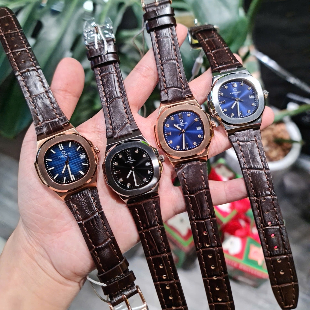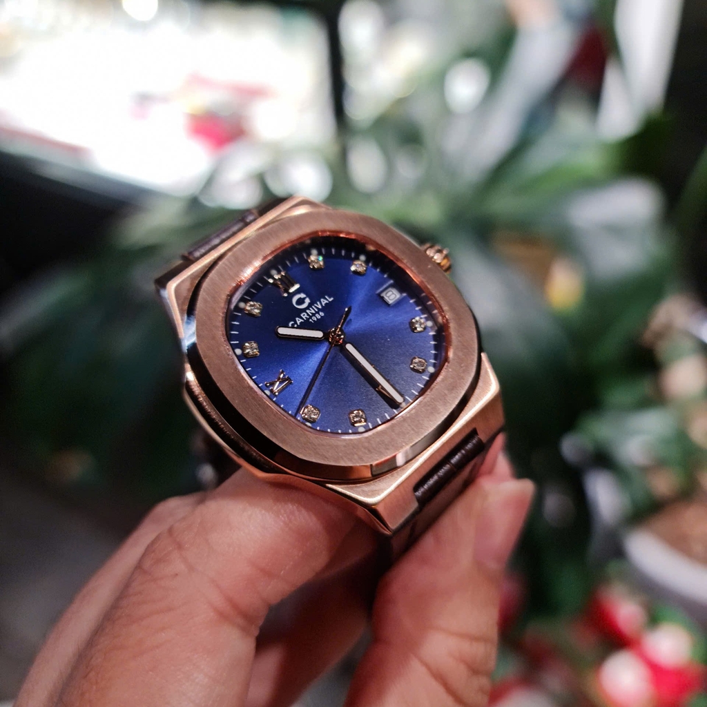 Chiếc đồng hồ trong hình mang thiết kế sang trọng và hiện đại với màu vàng hồng nổi bật. Mặt đồng hồ có hình vuông bo góc, tạo cảm giác mềm mại và tinh tế. Nền mặt số màu xanh dương, nổi bật với các cọc số La Mã và các điểm đánh dấu giờ đính đá, tạo điểm nhấn lấp lánh và tăng thêm vẻ cao cấp cho sản phẩm. Kim đồng hồ được thiết kế mảnh, tinh xảo, cùng với ô hiển thị ngày ở vị trí 3 giờ, mang lại tính năng hữu ích cho người dùng.
