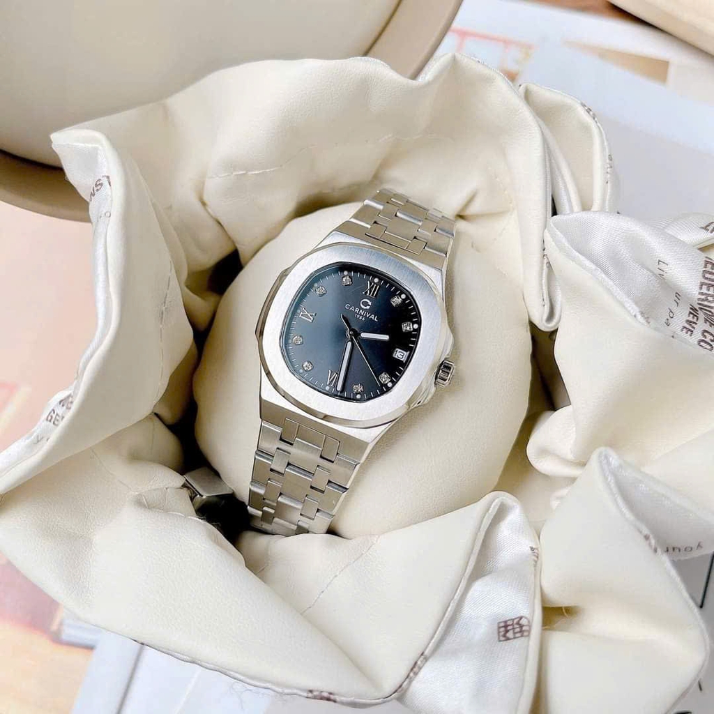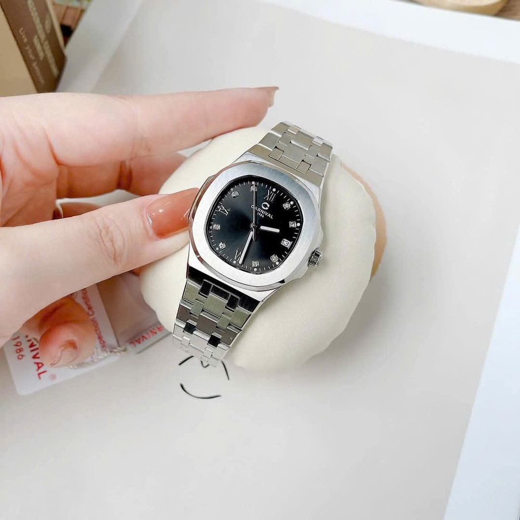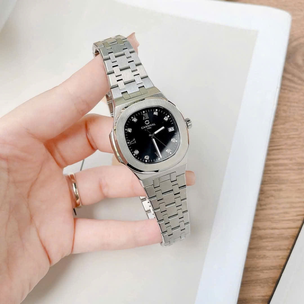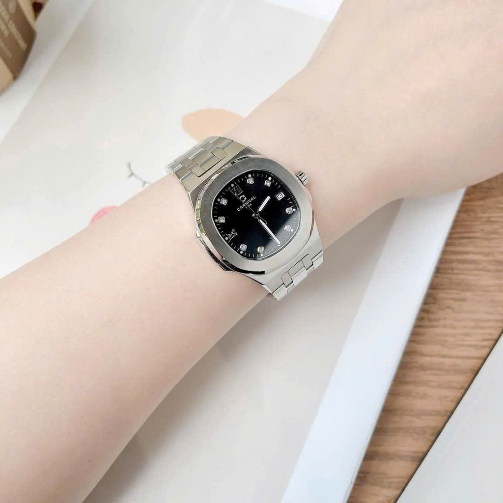 Chiếc đồng hồ trong hình mang thiết kế sang trọng và hiện đại. Mặt đồng hồ có hình vuông bo góc, tạo cảm giác mềm mại và tinh tế. Nền mặt số màu đen, nổi bật với các cọc số La Mã và các điểm đánh dấu giờ đính đá, tạo điểm nhấn lấp lánh và tăng thêm vẻ cao cấp cho sản phẩm. Kim đồng hồ được thiết kế mảnh, tinh xảo, cùng với ô hiển thị ngày ở vị trí 3 giờ, mang lại tính năng hữu ích cho người dùng.