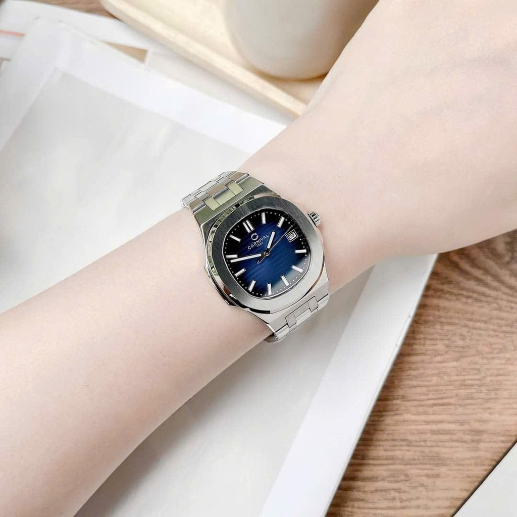 Chiếc đồng hồ trong hình mang thiết kế sang trọng và hiện đại. Mặt đồng hồ có hình vuông bo góc, tạo cảm giác mềm mại và tinh tế. Nền mặt số màu xanh dương, nổi bật với các cọc số La Mã và các điểm đánh dấu giờ đính đá, tạo điểm nhấn lấp lánh và tăng thêm vẻ cao cấp cho sản phẩm. Kim đồng hồ được thiết kế mảnh, tinh xảo, cùng với ô hiển thị ngày ở vị trí 3 giờ, mang lại tính năng hữu ích cho người dùng.