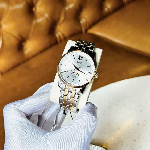 Citizen Quartz AK5006-58A – Vẻ đẹp tinh tế và sang trọng đến từ thương hiệu danh tiếng Citizen. Chiếc đồng hồ gây ấn tượng với mặt số trắng trang nhã, nổi bật là cửa sổ lịch tuần trăng độc đáo tại vị trí 6 giờ, tạo nên điểm nhấn thú vị cho thiết kế. Dây đeo kim loại hai tông màu vàng và bạc kết hợp hài hòa, mang lại vẻ ngoài đẳng cấp và thanh lịch. Citizen Quartz AK5006-58A không chỉ là một phụ kiện thời trang mà còn thể hiện phong cách lịch lãm và tinh tế của phái mạnh.