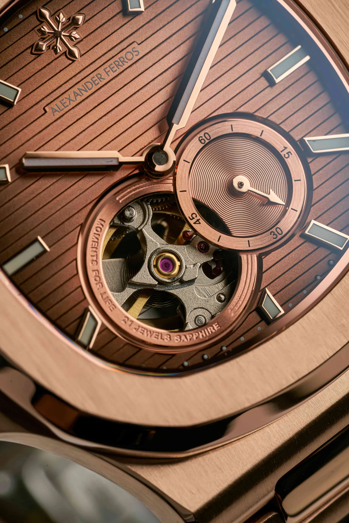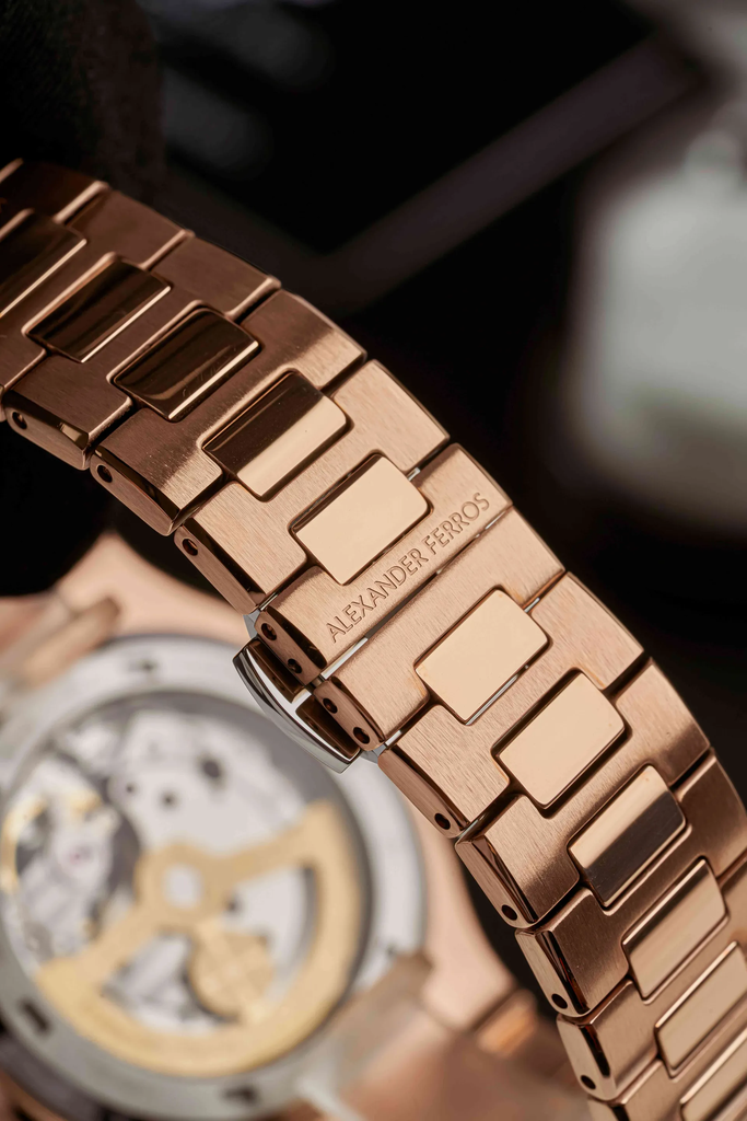 Đồng hồ Alexander Ferros 6312R-02 gây ấn tượng với thiết kế mặt vuông bo tròn hiện đại, mang hơi hướng thể thao sang trọng. Mặt số màu trắng họa tiết sọc tinh tế, kết hợp lộ tim open-heart và mặt phụ small seconds tạo điểm nhấn cơ khí cuốn hút. Vỏ thép và dây da hoàn thiện chắc chắn, tông vàng hồng thanh lịch, dễ phối với nhiều phong cách khác nhau. Kim và cọc số dạng baton nổi rõ, giúp quan sát thời gian thuận tiện trong nhiều điều kiện ánh sáng. Tổng thể mẫu 6312R-02 phù hợp cho nam giới yêu thích sự chỉn chu, mạnh mẽ nhưng vẫn tinh tế khi đeo hằng ngày hoặc đi làm, dự tiệc.