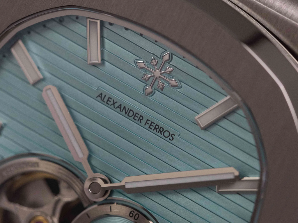 Đồng hồ Alexander Ferros 6312S/13 gây ấn tượng với thiết kế mặt vuông bo tròn hiện đại, mang hơi hướng thể thao sang trọng. Mặt số màu ice blue họa tiết sọc tinh tế, kết hợp lộ tim open-heart và mặt phụ small seconds tạo điểm nhấn cơ khí cuốn hút. Vỏ và dây kim loại hoàn thiện chắc chắn, tông bạc thanh lịch, dễ phối với nhiều phong cách khác nhau. Kim và cọc số dạng baton nổi rõ, giúp quan sát thời gian thuận tiện trong nhiều điều kiện ánh sáng. Tổng thể mẫu 6312S/13 phù hợp cho nam giới yêu thích sự chỉn chu, mạnh mẽ nhưng vẫn tinh tế khi đeo hằng ngày hoặc đi làm, dự tiệc.