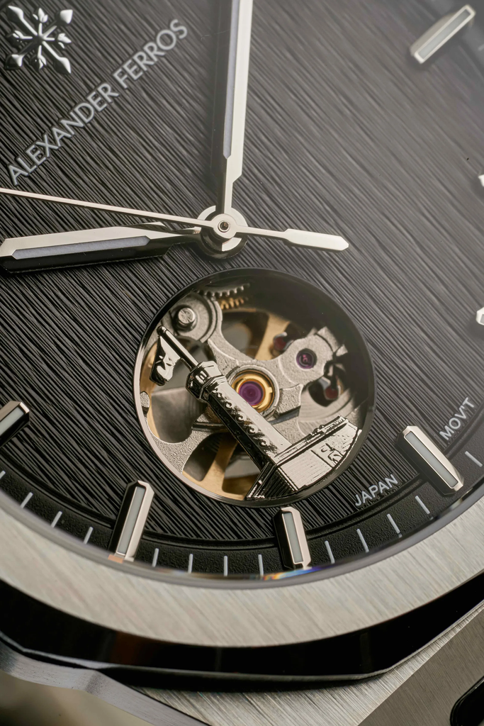 Đồng Hồ Alexander Ferros 9292S/01 Chiếc đồng hồ mang thiết kế hiện đại pha chút cổ điển, nổi bật với mặt số đen vân chải tinh tế, tạo chiều sâu và hiệu ứng ánh sáng sang trọng khi nhìn ở nhiều góc độ khác nhau. Điểm nhấn đặc biệt là thiết kế Open Heart ở vị trí 6 giờ, cho phép quan sát chuyển động cơ học bên trong, thể hiện rõ nét tinh thần của một chiếc đồng hồ cơ đích thực.