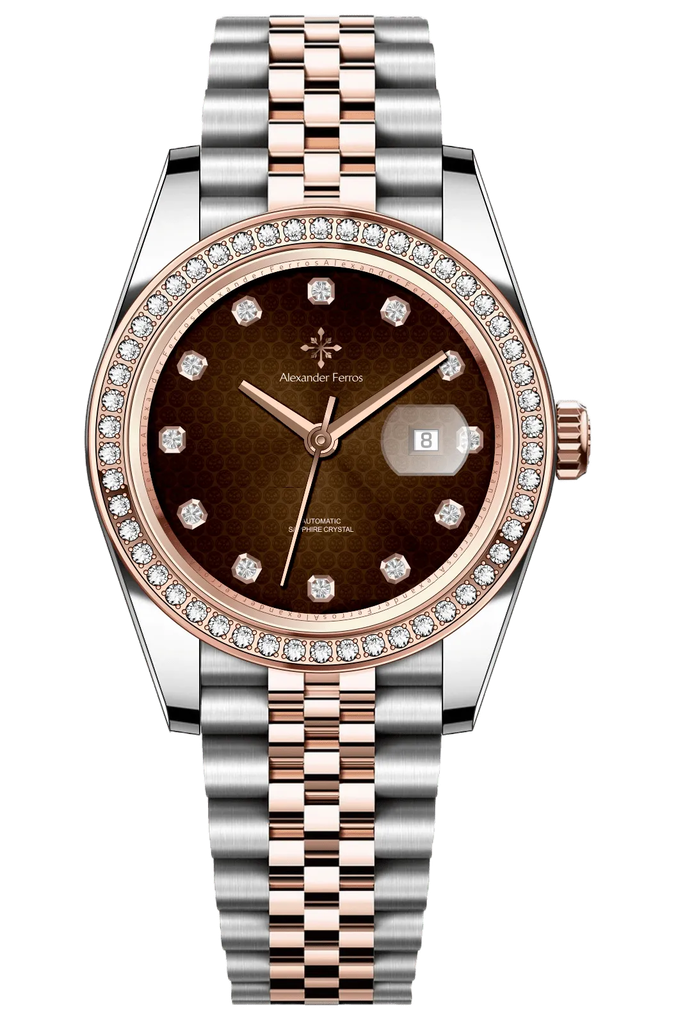 Đồng hồ Alexander Ferros model 8021D là bộ sưu tập đồng hồ mang phong cách thanh lịch và sang trọng. Thiết kế demi vàng hồng phối bạc cùng viền đính đá tạo nên vẻ ngoài cuốn hút.