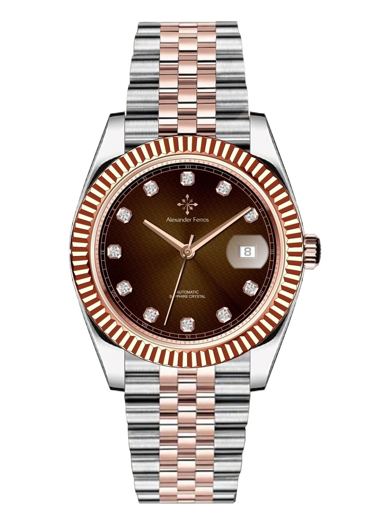 Đồng hồ cao cấp Alexander Ferros model 8032D gây ấn tượng với bộ máy Nhật Bản chính xác, kính sapphire chống trầy và khả năng chống nước tốt.