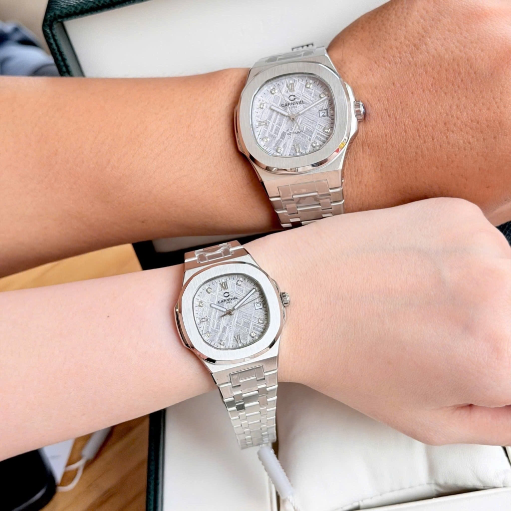 Bộ đôi đồng hồ Carnival 8160 phiên bản mặt số thiên thạch mang đến nét đẹp độc đáo, khác biệt và đầy sang trọng. Mặt số được thiết kế vân thiên thạch ấn tượng, phản chiếu ánh sáng tạo nên hiệu ứng cuốn hút ở mọi góc nhìn. Vỏ và dây thép không gỉ sáng bóng kết hợp cùng kim và cọc số bạc tinh tế, tôn lên vẻ hiện đại và thanh lịch cho cả hai phái.