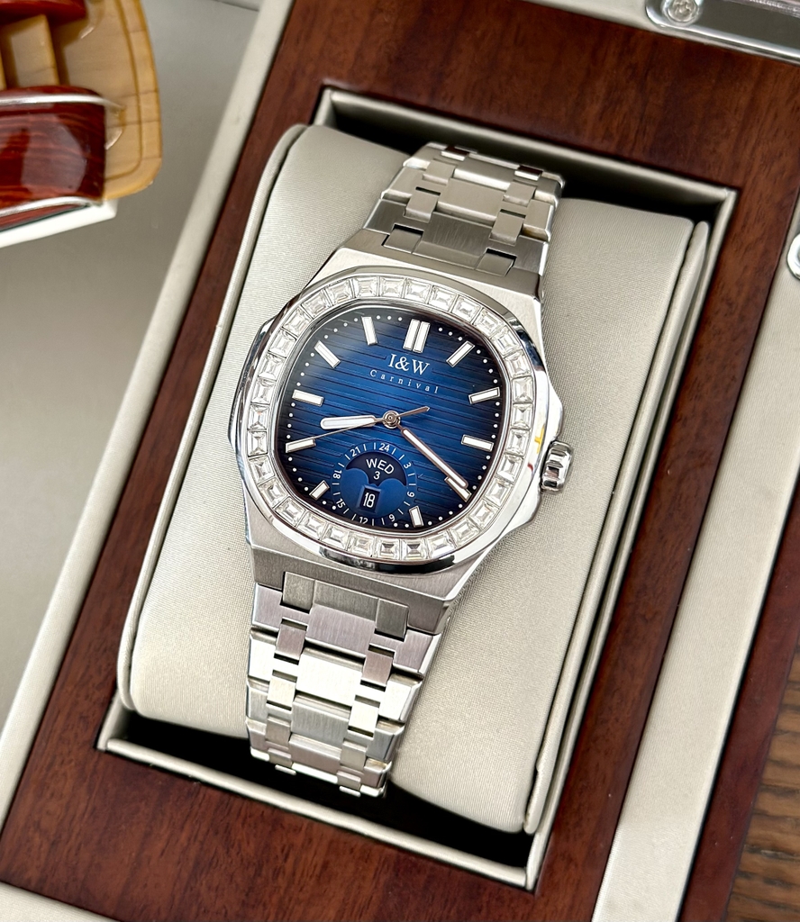 Đồng hồ nam I&W Carnival Nautilus 735G1 là mẫu đồng hồ nam size 42mm, mang dang dấp của những chiếc Patek Philippe huyền thoại. Đồng hồ mặt xanh dương hay còn gọi là xanh navi đầy nam tính. Đồng hồ có lịch thư tiện dụng. đồng hồ đính đá ở viền bezel cực kỳ sang chảnh, lấp lanh thu hút mọi ánh nhìn