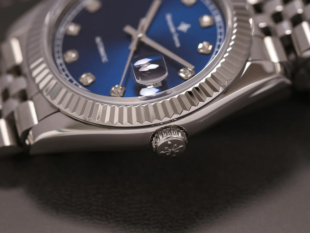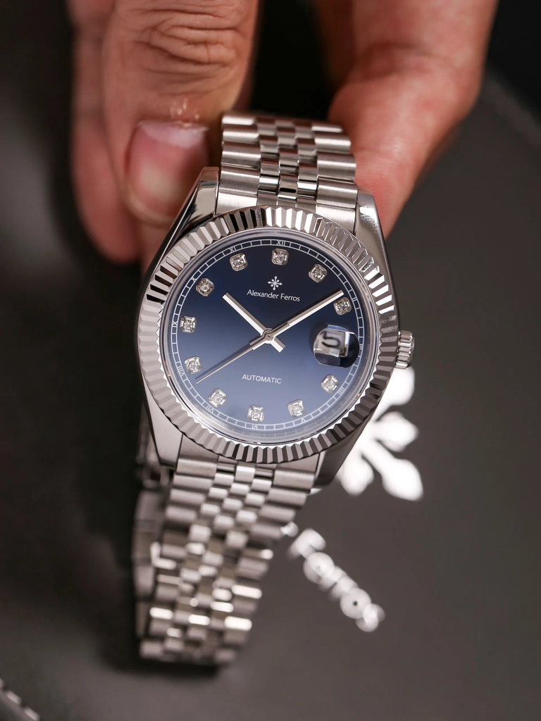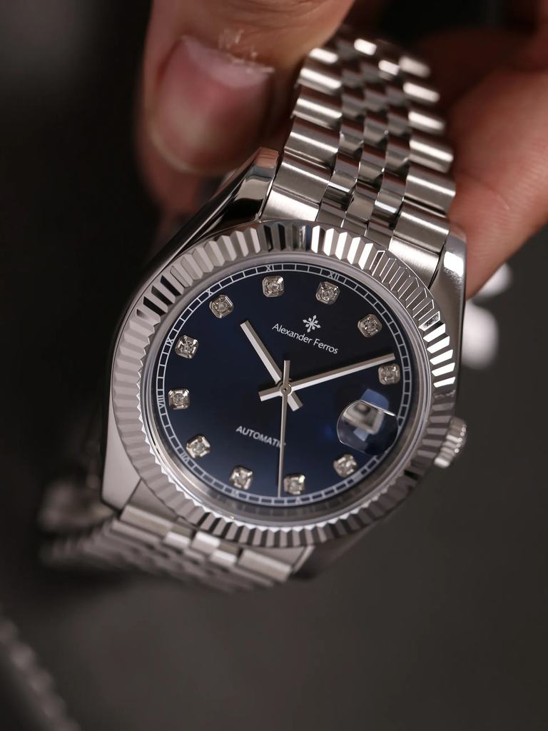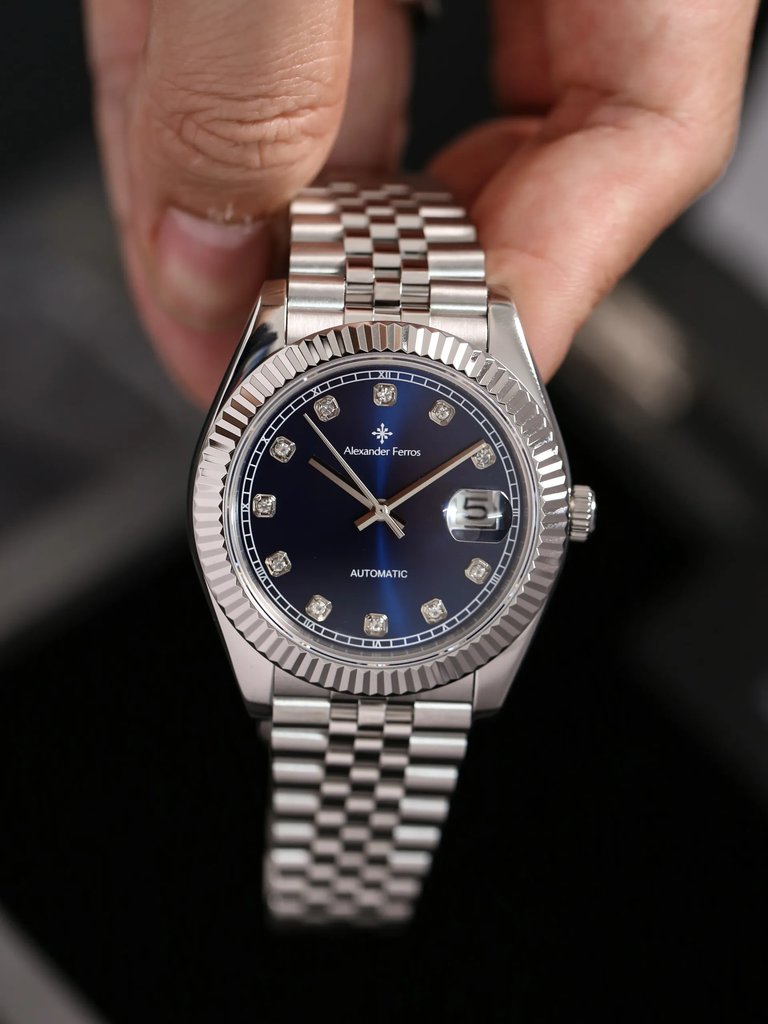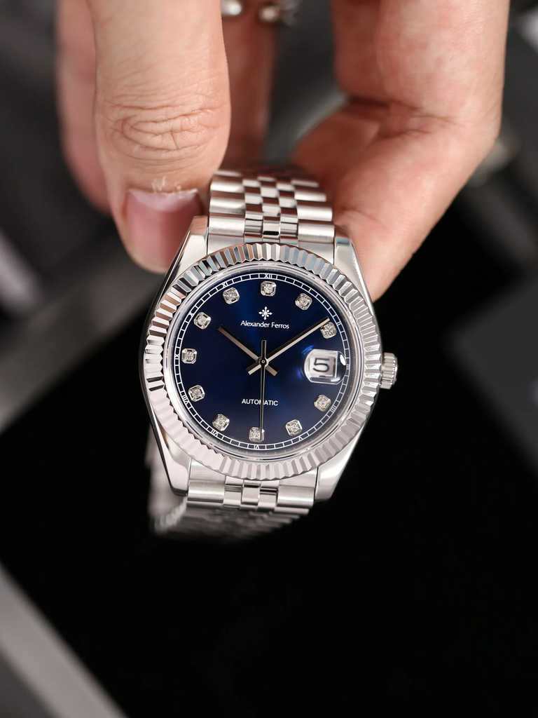 Phiên bản Alexander Ferros 8132S/05 sử dụng mặt số xanh navy kết hợp hiệu ứng sunray: