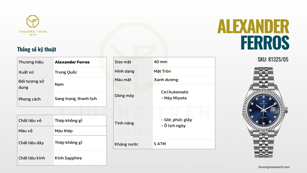 Alexander Ferros 8132S/05 hiện có tại THUONG TRAN WATCH - cửa hàng chuyên cung cấp đồng hồ chính hãng với dịch vụ tư vấn tận tâm, minh bạch về giá, mang đến trải nghiệm mua sắm an tâm và đáng tin cậy cho khách hàng