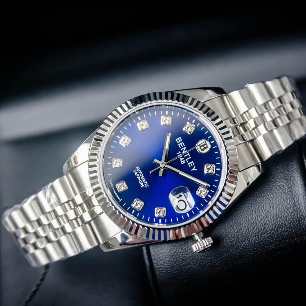Chiếc đồng hồ Bentley BL2333-15MWNI mang phong cách sang trọng và cổ điển. Mặt số có màu xanh dương với họa tiết vân tia sunburst, tạo hiệu ứng ánh sáng phản chiếu đẹp mắt. Các cọc số được đính đá lấp lánh, tăng thêm vẻ đẳng cấp và tinh tế. Kim giờ, kim phút và kim giây được thiết kế thanh mảnh nhưng sắc nét, giúp dễ dàng quan sát thời gian. Lịch ngày được đặt ở vị trí 3 giờ, đi kèm kính phóng đại giúp đọc thông tin thuận tiện hơn. Viền bezel có họa tiết khía răng cưa, tạo điểm nhấn mạnh mẽ cho thiết kế tổng thể. Dây đeo bằng thép không gỉ với kiểu dáng mắt xích nhỏ, mang lại cảm giác chắc chắn và thoải mái khi đeo.