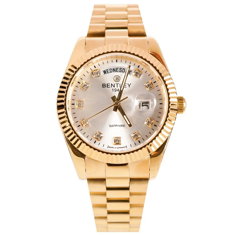Chiếc đồng hồ Bentley BL2333-10MKWI mang phong cách sang trọng và cổ điển. Các cọc số được đính đá lấp lánh, tăng thêm vẻ đẳng cấp và tinh tế. Kim giờ, kim phút và kim giây được thiết kế thanh mảnh nhưng sắc nét, giúp dễ dàng quan sát thời gian. Lịch ngày được đặt ở vị trí 3 giờ, đi kèm kính phóng đại giúp đọc thông tin thuận tiện hơn. Viền bezel có họa tiết khía răng cưa, tạo điểm nhấn mạnh mẽ cho thiết kế tổng thể. Dây đeo bằng thép không gỉ với kiểu dáng mắt xích nhỏ, mang lại cảm giác chắc chắn và thoải mái khi đeo.