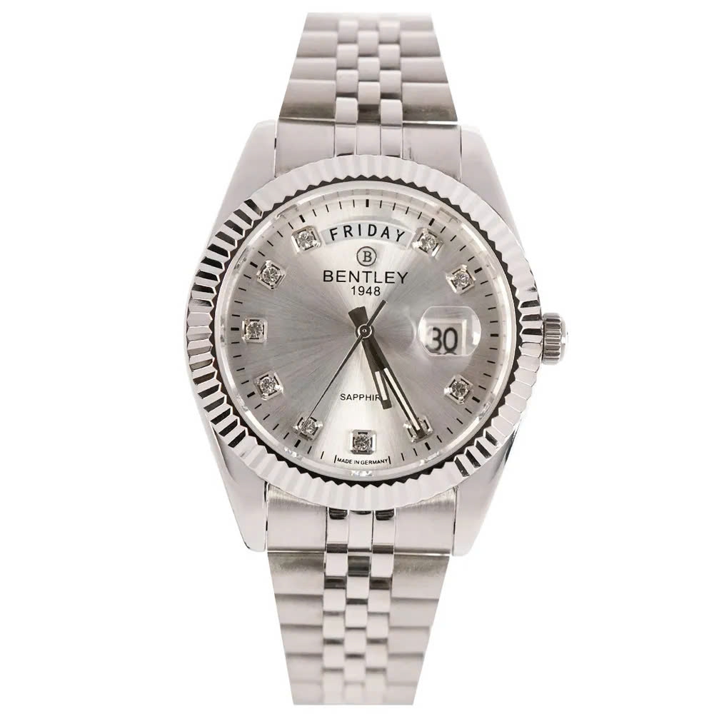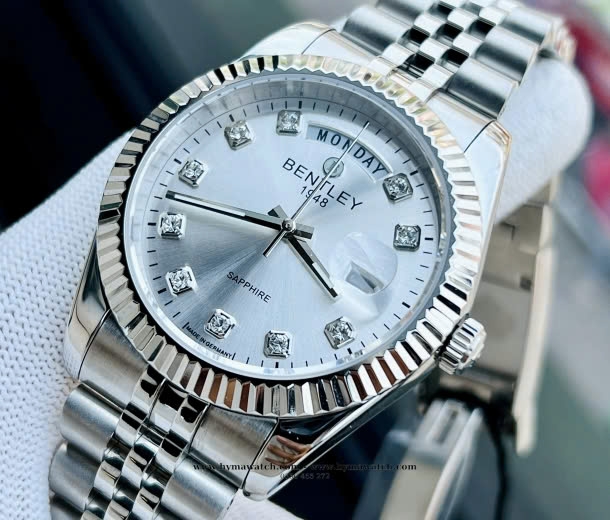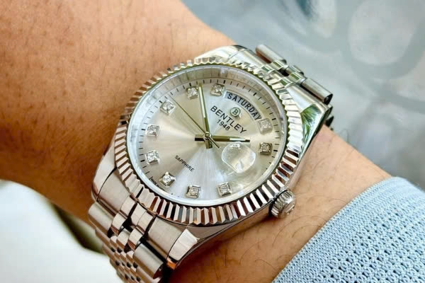 Chiếc đồng hồ Bentley BL2333-10MWWI mang phong cách sang trọng và cổ điển. Mặt số có màu bạc với họa tiết vân tia sunburst, tạo hiệu ứng ánh sáng phản chiếu đẹp mắt. Các cọc số được đính đá lấp lánh, tăng thêm vẻ đẳng cấp và tinh tế. Kim giờ, kim phút và kim giây được thiết kế thanh mảnh nhưng sắc nét, giúp dễ dàng quan sát thời gian. Lịch ngày được đặt ở vị trí 3 giờ, đi kèm kính phóng đại giúp đọc thông tin thuận tiện hơn. Viền bezel có họa tiết khía răng cưa, tạo điểm nhấn mạnh mẽ cho thiết kế tổng thể. Dây đeo bằng thép không gỉ với kiểu dáng mắt xích nhỏ, mang lại cảm giác chắc chắn và thoải mái khi đeo.