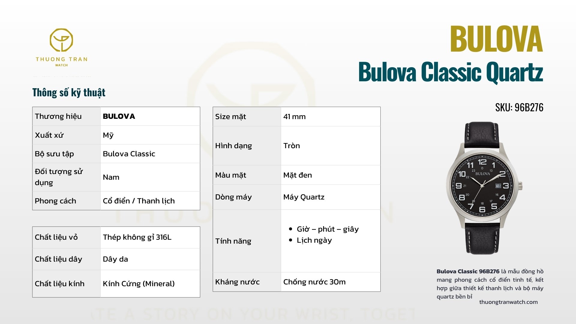 Bulova Classic 96B276 hiện có tại THUONG TRAN WATCH - cửa hàng chuyên cung cấp đồng hồ chính hãng với dịch vụ tư vấn tận tâm, minh bạch về giá, mang đến trải nghiệm mua sắm an tâm và đáng tin cậy cho khách hàng
