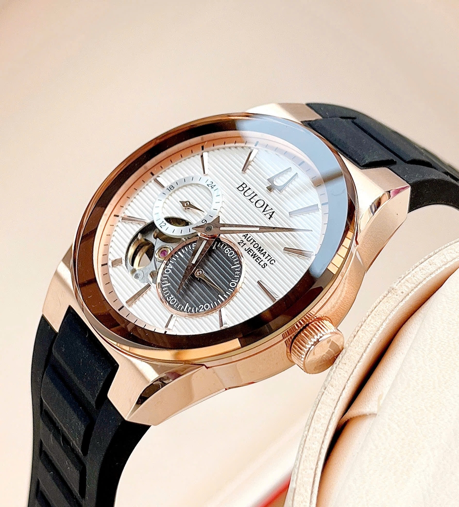 Bulova Latin Grammy Edition 97A186 nổi bật với vỏ thép mạ vàng hồng sang trọng, mặt số lộ cơ tinh xảo và các chi tiết kim loại sắc nét. Dây cao su đen thể thao tạo sự cân bằng giữa vẻ hiện đại và đẳng cấp. Mẫu đồng hồ tự động mang lại cảm giác mạnh mẽ nhưng vẫn tinh tế.