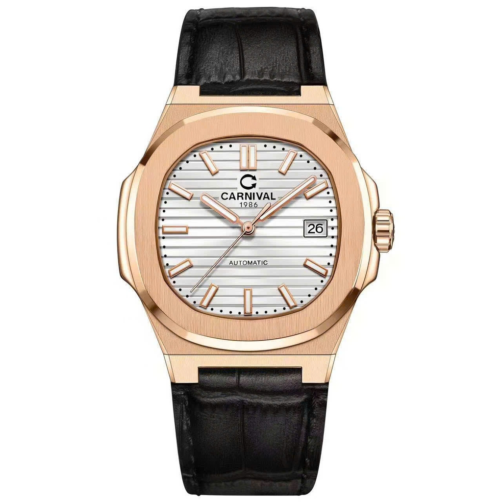 Đồng hồ nam Carnival 8108G1-VH-DD-T mang thiết kế sang trọng với tông màu vàng hồng nổi bật, tạo nên vẻ đẹp tinh tế và đẳng cấp. Mặt đồng hồ có hình dạng bầu dục góc cạnh, kết hợp với các đường vân ngang trên nền màu trắng, tạo cảm giác hiện đại và mạnh mẽ. Các cọc số và kim được phủ dạ quang, giúp dễ dàng quan sát trong điều kiện thiếu sáng. Dây đeo da tạo cảm giác sang trọng và ôm tay. Đây là một lựa chọn lý tưởng cho những ai yêu thích sự lịch lãm và phong cách.