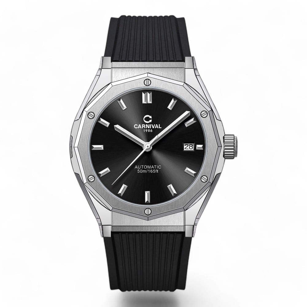 Đồng hồ Carnival 8168G là mẫu đồng hồ nam size 42mm, vỏ ngoài màu thép nguyên bản sang chảnh, thời thượng. Phần viền đồng hồ góc cạnh mạnh mẽ, đồng hồ có phần dây đeo cao su cao cấp, tạo cảm giác thoải mái dễ chịu, fix tay vừa vặn.
