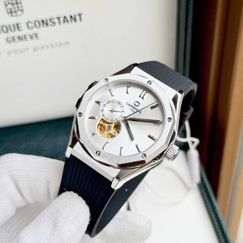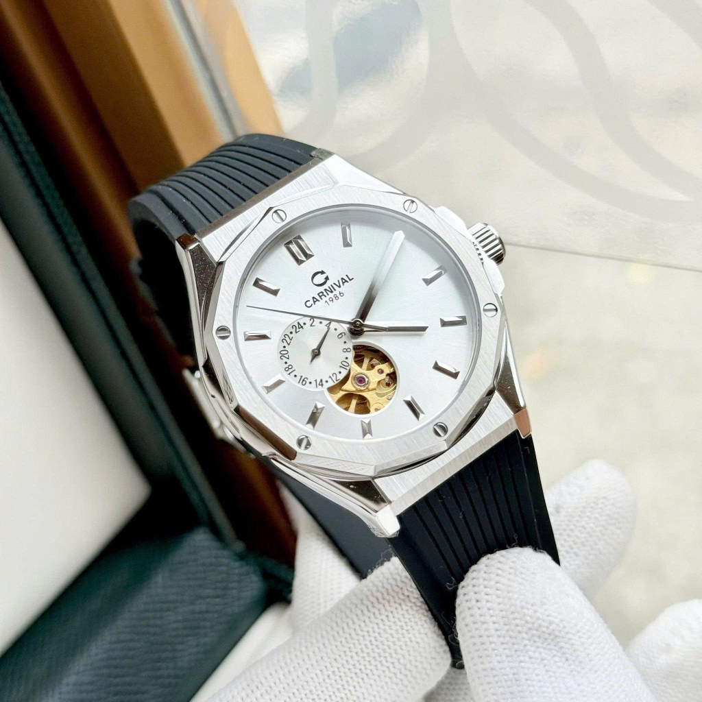 Đồng hồ Carnival 8189G là mẫu đồng hồ nam size 42mm, vỏ ngoài màu thép nguyên bản sang chảnh, thời thượng. Phần viền đồng hồ góc cạnh mạnh mẽ, mặt đồng hồ có thiết kế lộ cơ đan xen lịch ngày tinh tế, phần dây đeo cao su cao cấp, tạo cảm giác thoải mái dễ chịu, fix tay vừa vặn.