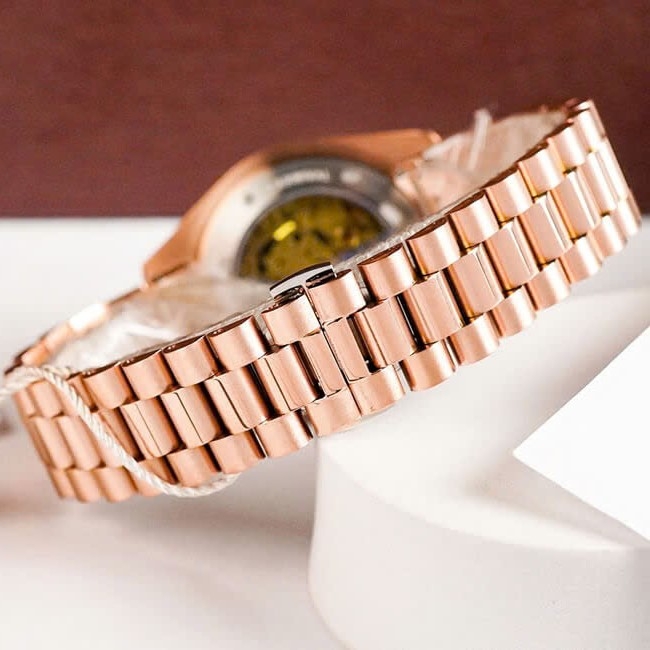 | Chất liệu dây đeo | - Thép không gỉ mạ PVD - Màu vàng hồng - Khóa bướm |