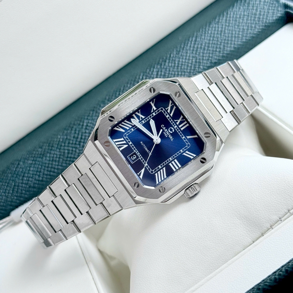 Chiếc Carnival Automatic 8169G-VT-X khoác lên mình sắc xanh dương sâu thẳm như đại dương mùa đông – lấp lánh, huyền bí và cuốn hút không rời mắt. Mặt số ánh xanh tỏa ra những tia sáng như ánh mặt trời phản chiếu trên mặt nước, tạo nên chiều sâu thị giác đầy mê hoặc. Cọc số La Mã trắng nổi bật như những cột mốc cổ điển trên hành trình thời gian, vừa trang trọng vừa mạnh mẽ.