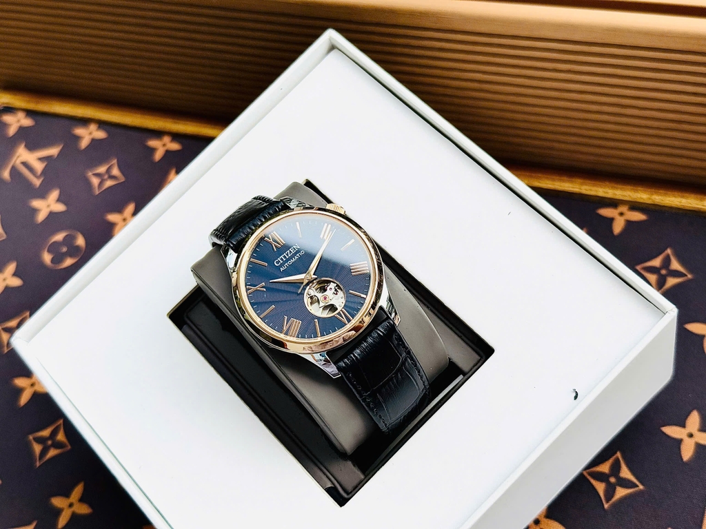 Citizen Automatic Open Heart NH9136-02L mang phong cách lịch lãm với mặt số xanh navy sang trọng, điểm nhấn lộ tim tinh tế khoe chuyển động cơ khí. Vỏ thép không gỉ mạ vàng kết hợp dây da đen cao cấp, tạo nên vẻ ngoài đẳng cấp và cuốn hút cho phái mạnh. Đây là lựa chọn lý tưởng cho những quý ông yêu thích sự tinh xảo và cổ điển.