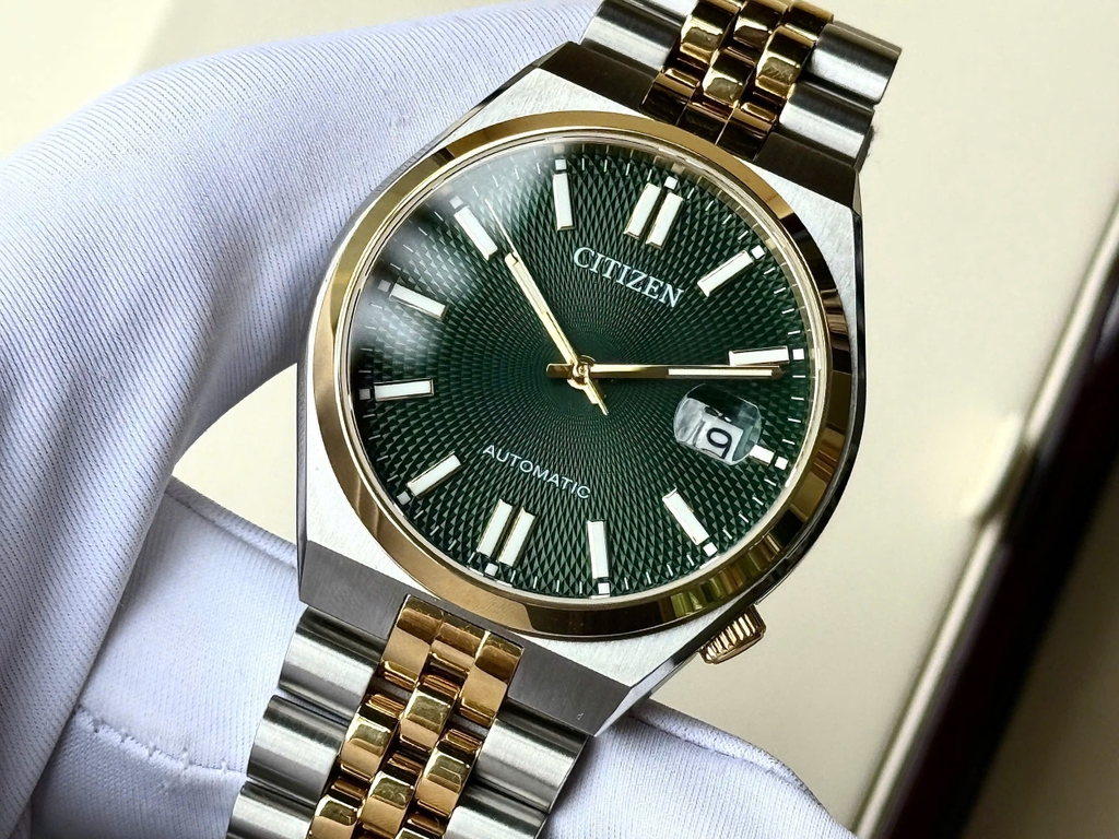Chiếc Citizen Automatic NK0024-54X này sở hữu thiết kế demi vàng – bạc đầy cuốn hút mang lại sự cân bằng giữa sang trọng và trẻ trung. Mặt số xanh lá với họa tiết Guilloché tinh xảo, nổi bật cùng kim và cọc số phủ vàng và dạ quang phát cực sáng trong bóng tối. Ô lịch ngày tại vị trí 3 giờ được trang bị kính lúp phóng đại tiện lợi cho việc quan sát hàng ngày. Dây thép không gỉ cao cấp chắc chắn vừa tôn lên vẻ lịch lãm của người đeo. Bộ máy cơ Nhật Bản bền bỉ chính xác và khẳng định đẳng cấp và giá trị sử dụng lâu dài. Đây là phụ kiện hoàn hảo dành cho quý ông yêu thích sự khác biệt và tinh tế.