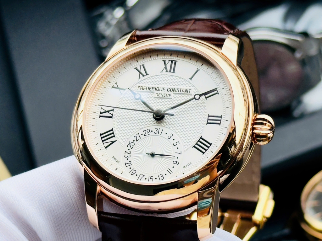 Frederique Constant Manufacture FC-710MC4H4 mang vẻ đẹp cổ điển và sang trọng đậm chất Thụy Sĩ. Mặt số tinh xảo với cọc số La Mã, kim thanh lịch cùng ô hiển thị lịch độc đáo ở góc 6 giờ. Vỏ mạ vàng hồng kết hợp dây da cao cấp, tạo nên phong thái đẳng cấp cho quý ông yêu sự tinh tế.