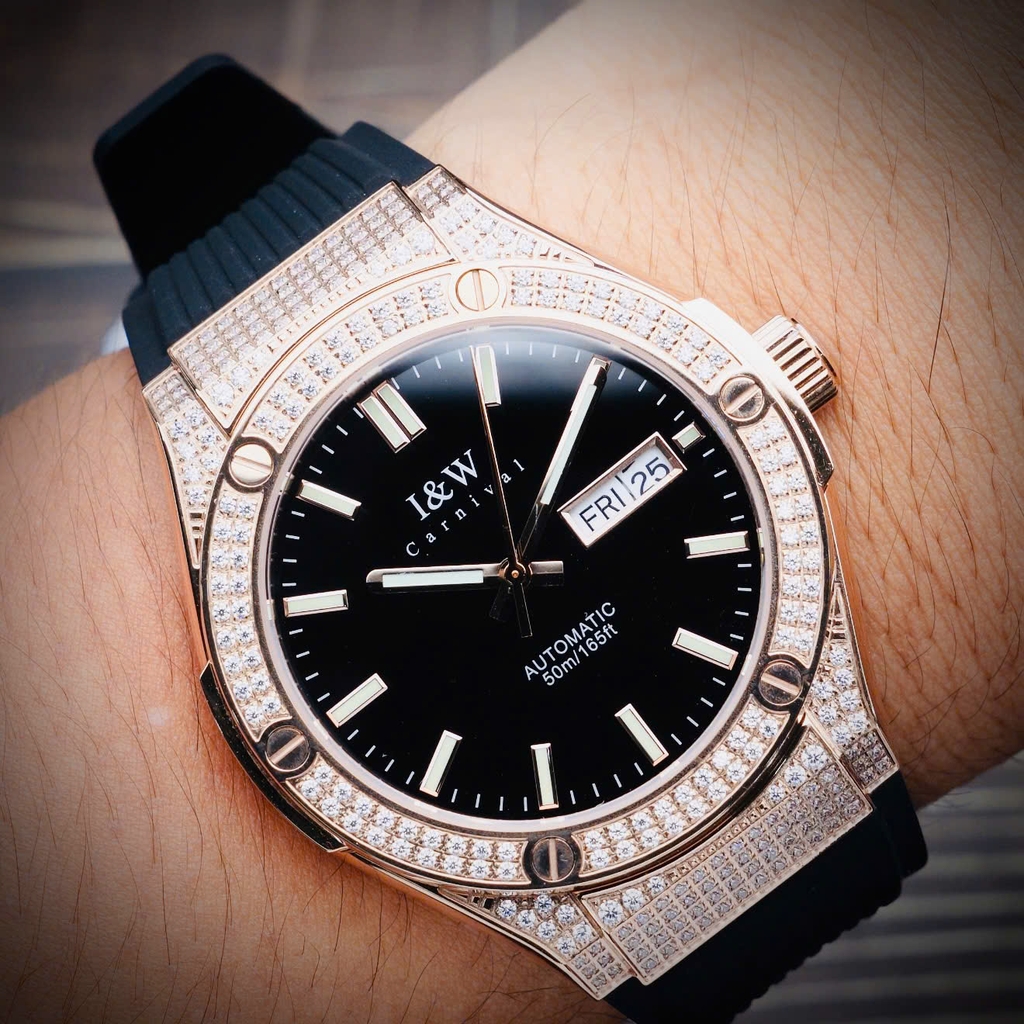 I&W CARNIVAL IW55851G3-S9 bản thiết kế viền đá sang trọng tinh tế, mặt số màu đen đơn giản với các vạch chỉ giờ và kim phủ dạ quang giúp người dùng dễ dàng xem giờ trong mọi điều kiện ánh sáng. Điểm nổi bật là ô hiển thị ngày và thứ tại vị trí 3 giờ, mang lại sự tiện dụng cho người đeo.