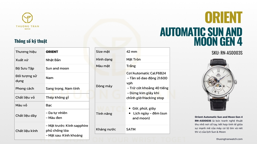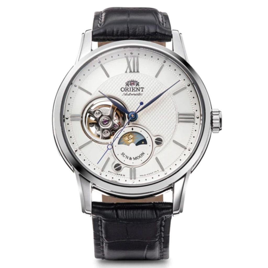 Đồng hồ nam Orient Automatic Sun and Moon Gen 4 RN-AS0003S (Nội địa) là bức tranh nghệ thuật thu nhỏ nơi cổ tay, kết hợp tinh tế giữa sự mạnh mẽ của máy cơ lộ tim và nét thi vị của lịch Sun & Moon. Mặt số trắng thanh lịch, điểm nhấn là cửa sổ open-heart để lộ nhịp đập cơ khí như trái tim sống động, hòa cùng ô lịch ngày – đêm lãng mạn tựa dòng chảy thời gian bất tận. Dây da đen sang trọng, viền thép sáng bóng, tất cả tạo nên một tổng thể vừa cổ điển vừa hiện đại, dành cho quý ông trân trọng từng khoảnh khắc và yêu thích sự khác biệt tinh tế.