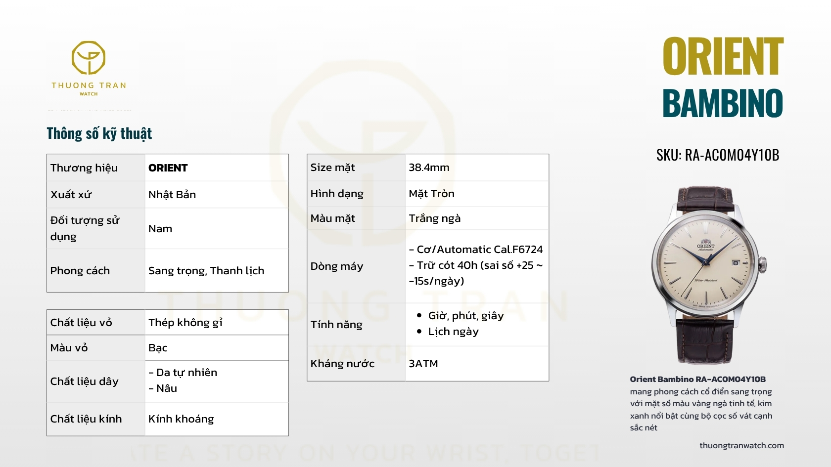 Orient Bambino RA-AC0M04Y10B mang phong cách cổ điển sang trọng với mặt số màu vàng ngà tinh tế, kim xanh nổi bật cùng bộ cọc số vát cạnh sắc nét. Thiết kế kính cong đặc trưng kết hợp dây da nâu cao cấp, tạo nên vẻ thanh lịch và lịch lãm cho phái mạnh. Đây là lựa chọn lý tưởng cho những ai yêu thích đồng hồ dress watch đậm chất truyền thống.