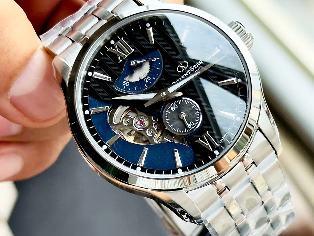 Đồng hồ Orient Star Layered Skeleton Automatic RE-AV0B03B00B mang thiết kế lộ cơ tinh xảo, khoe trọn bộ máy cơ khí chuyển động đầy cuốn hút. Mặt số phối hai tông xanh – đen độc đáo cùng họa tiết layered hiện đại, tạo chiều sâu và sự khác biệt rõ nét trên cổ tay. Trang bị bộ máy automatic bền bỉ, vận hành mượt mà, tích hợp thang đo năng lượng tiện dụng. Vỏ và dây thép không gỉ sáng bóng, chắc chắn, phù hợp cả đi làm lẫn đi chơi. Kính sapphire chống trầy xước tốt, giúp bảo vệ mặt số luôn sắc nét theo thời gian. Đây là lựa chọn hoàn hảo cho anh em yêu thích đồng hồ cơ vừa sang trọng vừa cá tính.