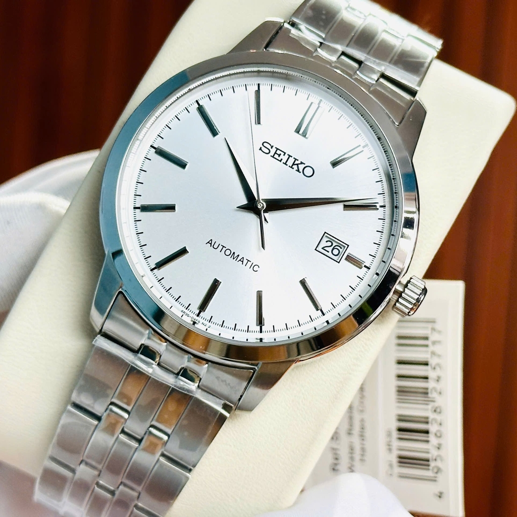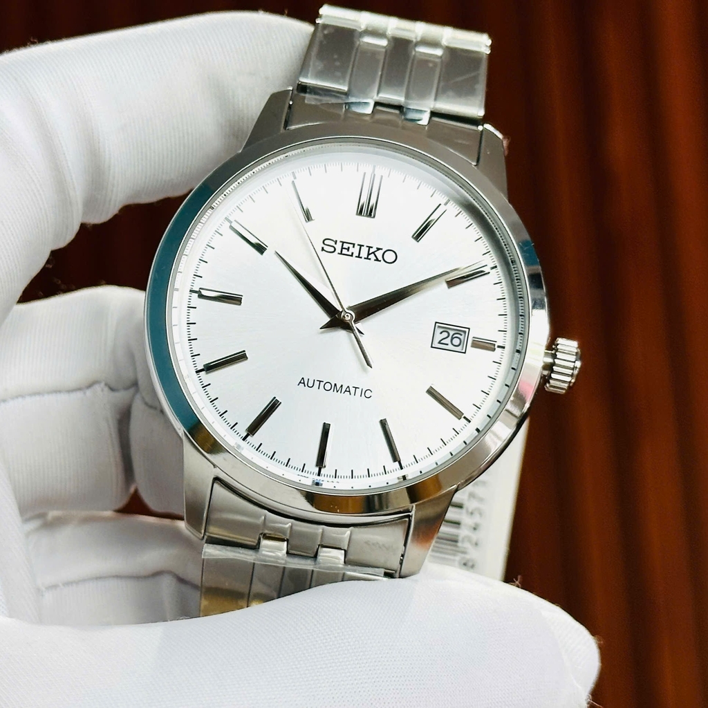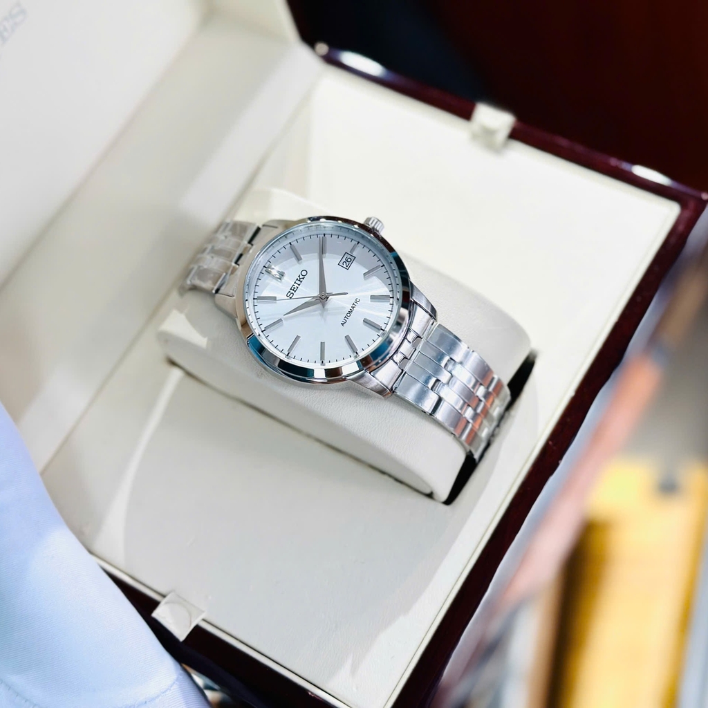 Chiếc đồng hồ Seiko SRPH85K1 với thiết kế thanh lịch và tối giản. Mặt số màu trắng kết hợp với các cọc số và kim dạng thanh mảnh tạo nên vẻ đẹp tinh tế và sang trọng. Dây đeo bằng thép không gỉ chắc chắn, mang lại sự bền bỉ và thoải mái khi sử dụng. Đồng hồ có chức năng hiển thị ngày ở vị trí 3 giờ, giúp người dùng dễ dàng theo dõi lịch. Thiết kế đơn giản nhưng đầy cuốn hút, phù hợp với nhiều phong cách từ công sở đến dạo phố. Đây là một lựa chọn lý tưởng cho những ai yêu thích sự tinh tế, bền bỉ và chất lượng của thương hiệu Seiko.