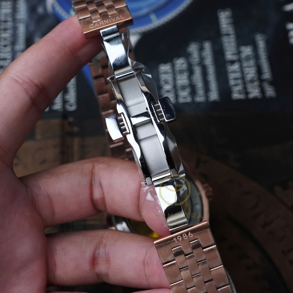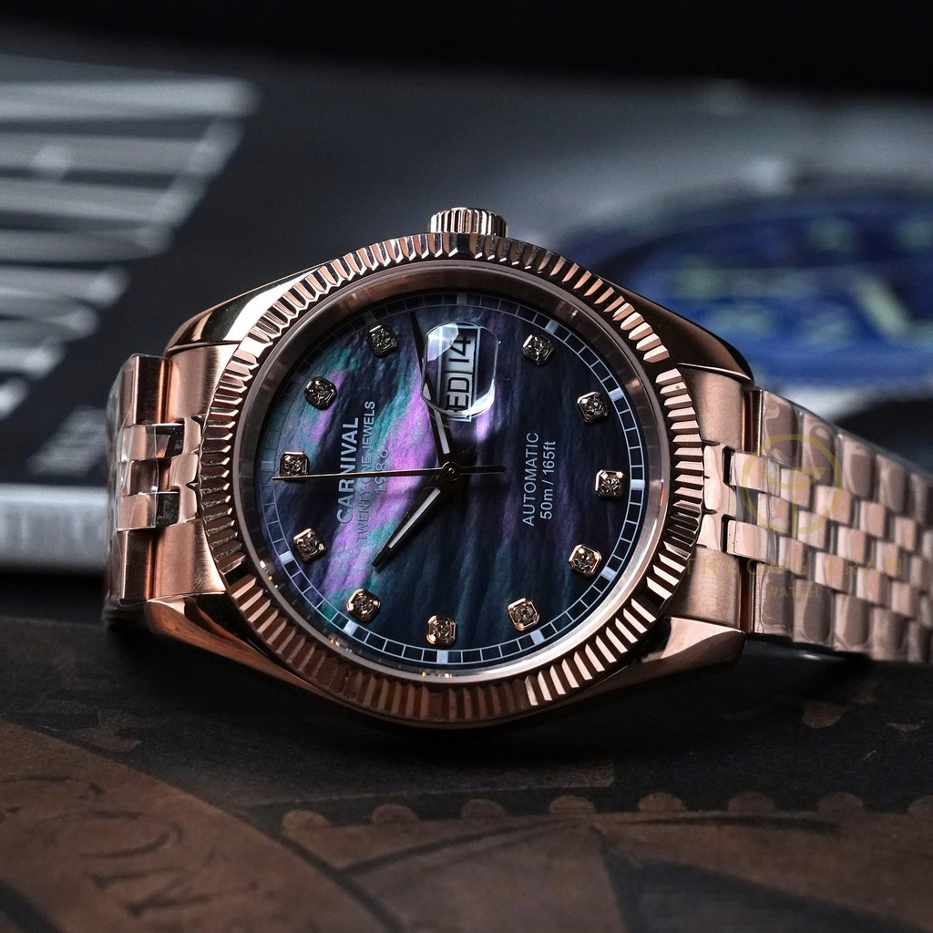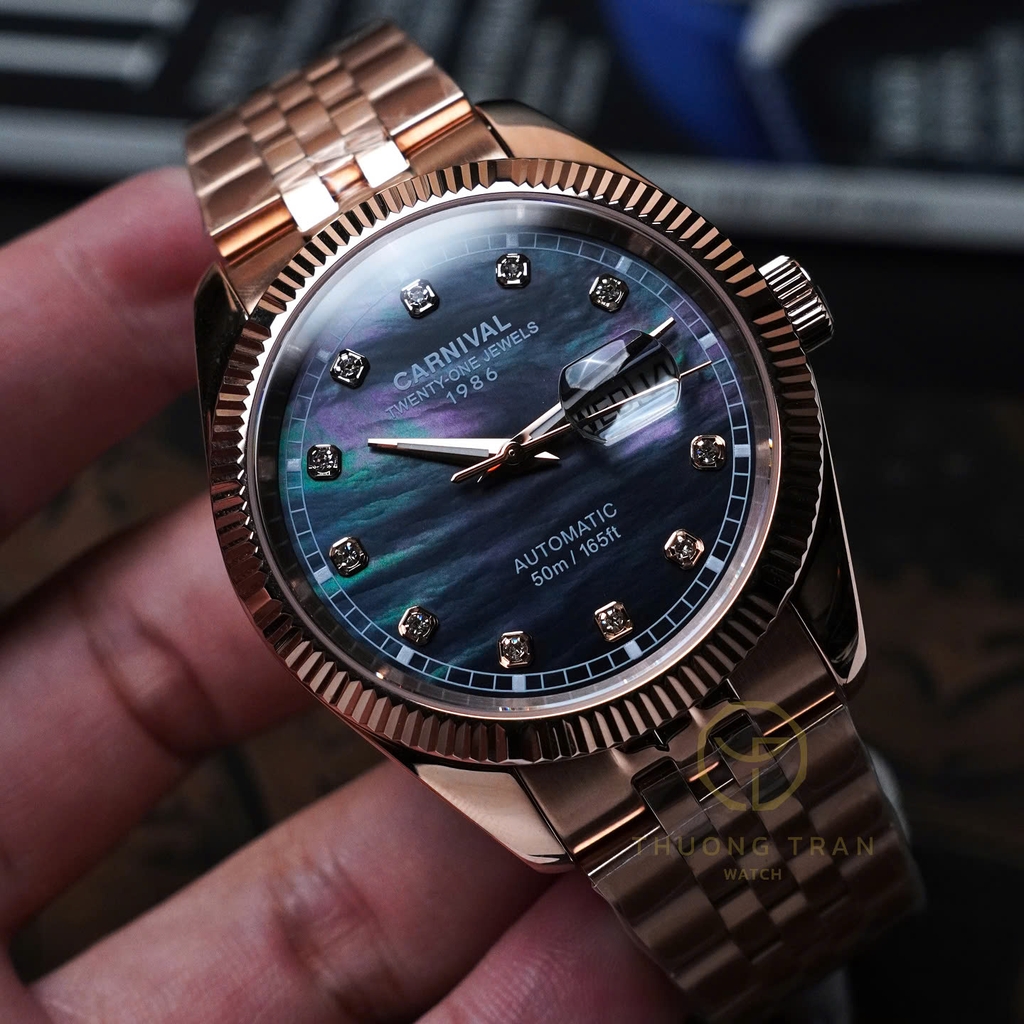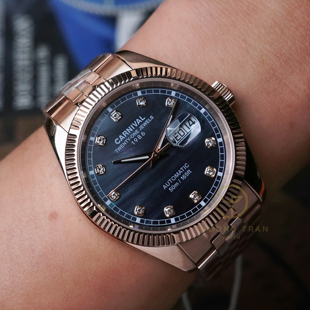 Đồng hồ nam Carnival xà cừ 8131G-VH-BLACK MOP với thiết kế phần vỏ và dây đeo từ thép không gỉ mạ PVD vàng hồng kết hợp cùng dial khảm xà cừ đen, cọc số đính đá mang lại cảm giác vô cùng sang trọng và tinh tế. Đây là mẫu đồng hồ dành cho những ai yêu thích sự đơn giản nhưng không kém phần sang trọng, thích hợp cho mọi ngữ cảnh.