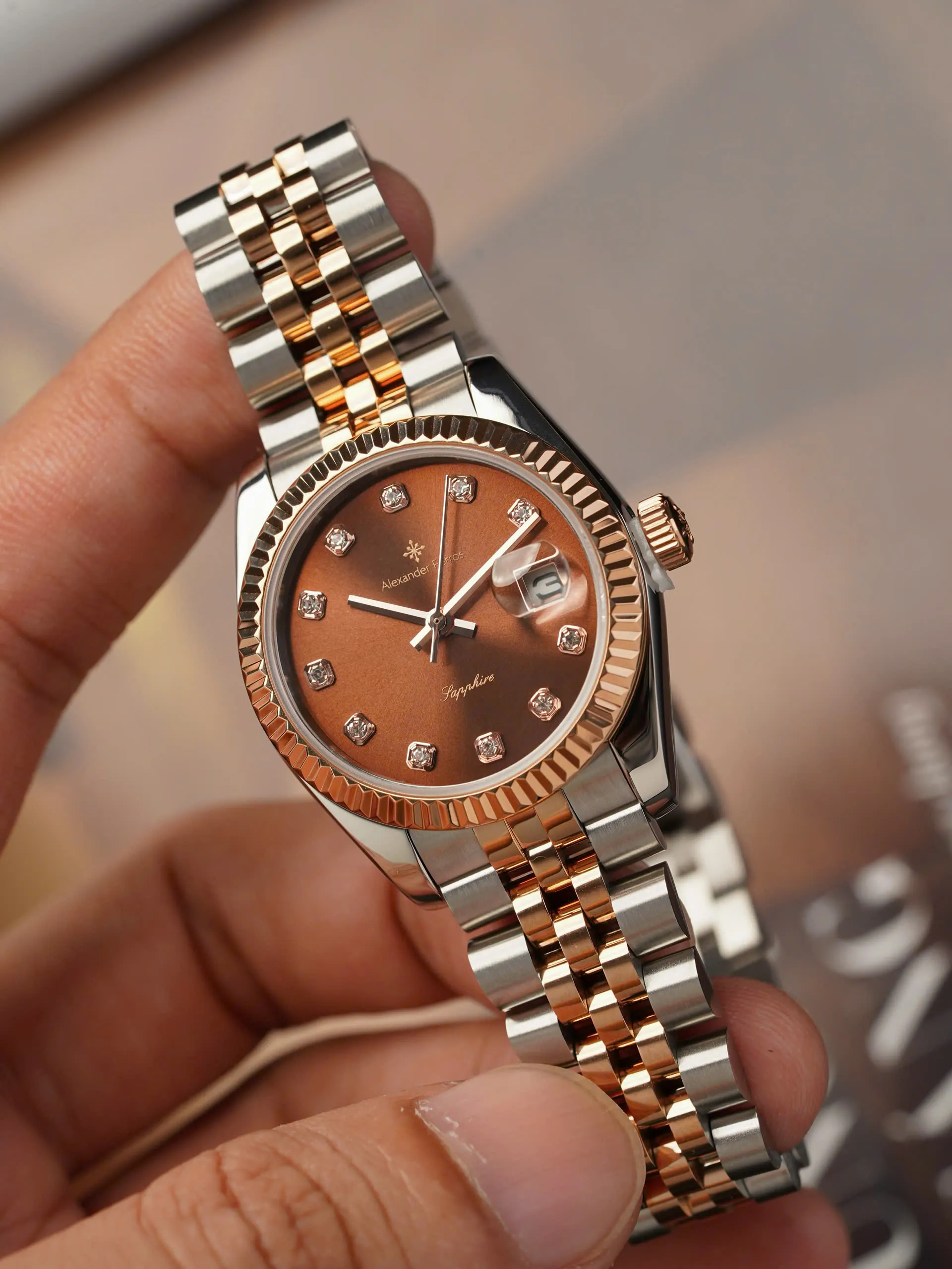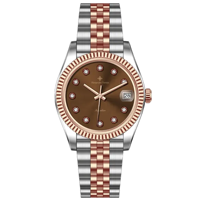 Alexander Ferros 8222D/08 – Đồng hồ nữ demi vàng hồng, mặt nâu thanh lịch, kính sapphire