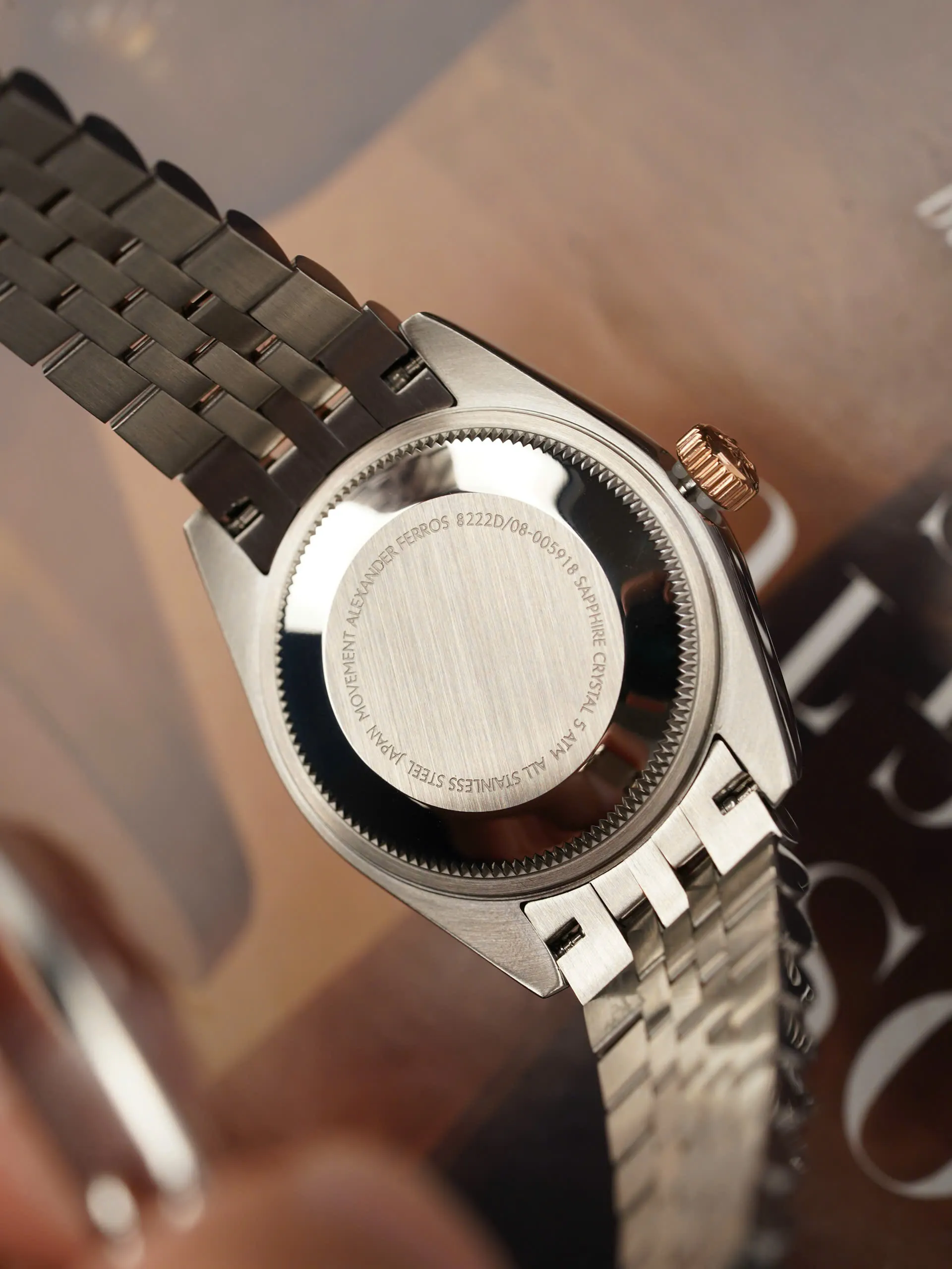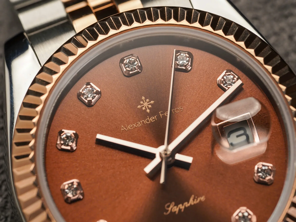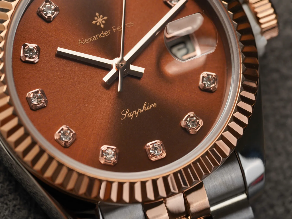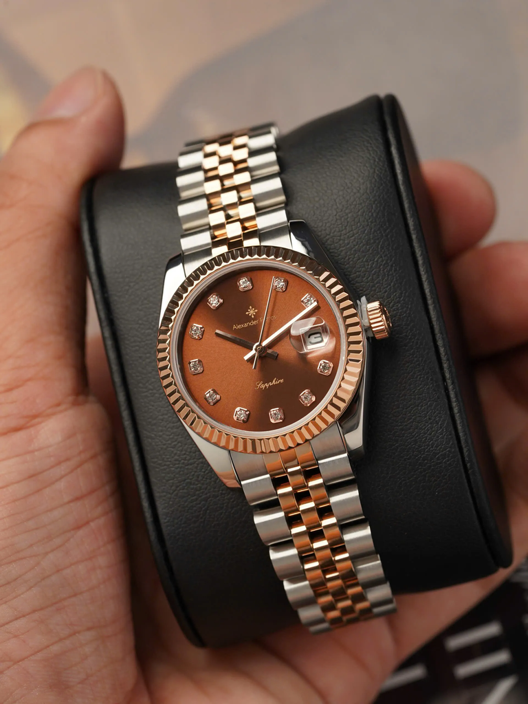 Alexander Ferros 8222D/08 là mẫu đồng hồ nữ thuộc phân khúc phổ thông – trung cấp, tập trung vào thiết kế mang tính thẩm mỹ cao với định hướng dresswatch thanh lịch. Sự kết hợp giữa tông màu nâu chocolate, dây demi vàng hồng và chi tiết đính đá giúp sản phẩm phù hợp với nhóm khách hàng nữ yêu thích phong cách nhẹ nhàng nhưng vẫn có điểm nhấn nổi bật
