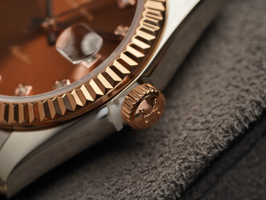Hệ thống cọc số được đính đá tại 12 vị trí, đóng vai trò vừa là điểm nhận diện thời gian vừa mang tính trang sức. Ô lịch ngày được đặt tại góc 3 giờ, giữ bố cục cân đối và đảm bảo khả năng quan sát trong sử dụng hàng ngày