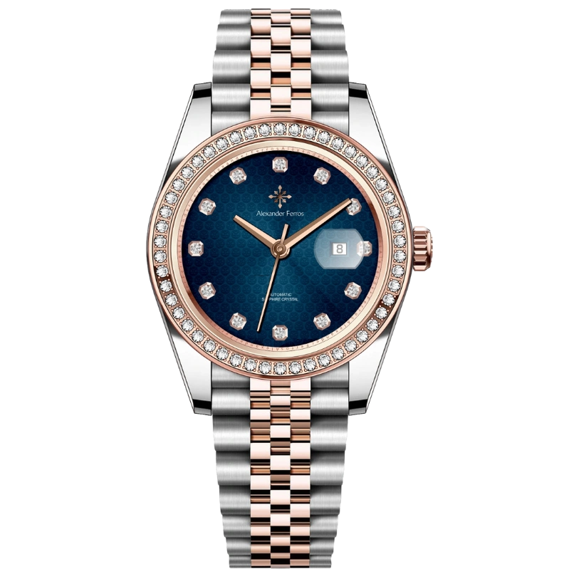 Đồng hồ Alexander Ferros model 8201D là bộ sưu tập đồng hồ mang phong cách thanh lịch và sang trọng. Thiết kế demi vàng hồng phối bạc cùng viền đá tạo nên vẻ ngoài cuốn hút.