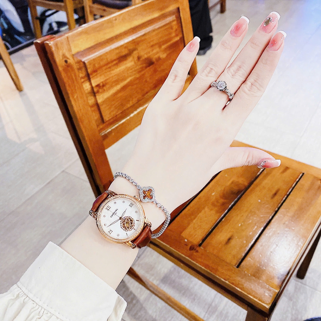 Mẫu đồng hồ nữ Carnival nổi bật với thiết kế sang trọng, mặt số khảm trai tinh tế kết hợp viền đính đá lấp lánh. Điểm nhấn ở vị trí 6 giờ là chi tiết hoa văn xoay đầy cuốn hút, mang lại vẻ đẹp thanh lịch và quý phái cho phái đẹp. Dây da nâu mềm mại tôn lên sự cổ điển và dễ phối cùng mọi trang phục.