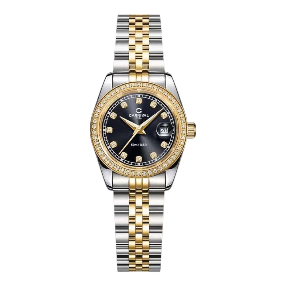 Phiên bản 8131L2-CV-D sở hữu thiết kế demi vàng – bạc sang trọng, kết hợp cùng mặt số đen huyền bí, tạo nên vẻ đẹp thanh lịch và sang trọng. Các cọc số đính đá lấp lánh nổi bật mang lại sự nhẹ nhàng nhưng đầy cuốn hút, phù hợp với phong cách nữ tính và tinh tế.