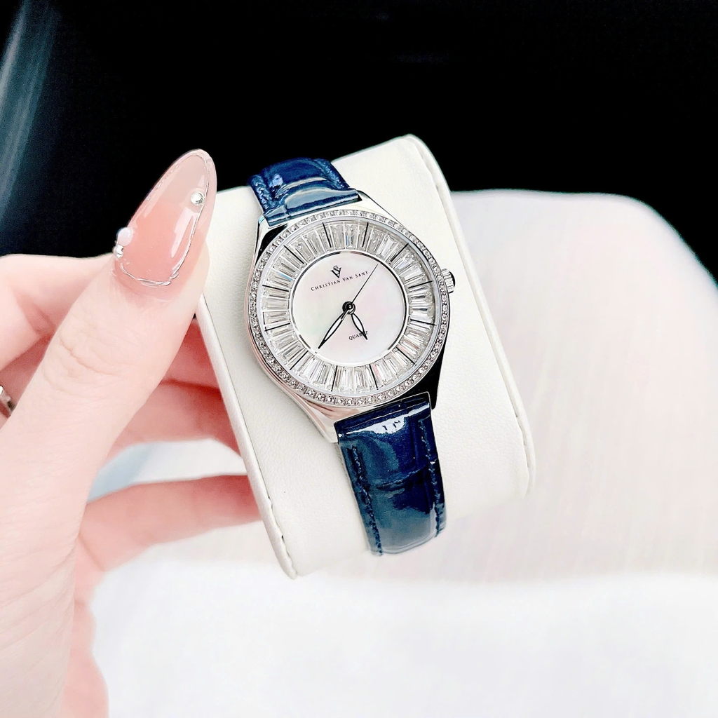 Christian Van Sant Luna - CV3202 toát lên vẻ đẹp sang trọng và hiện đại với mặt số vân xà cừ trắng tinh tế, điểm xuyết viền đá baguette lấp lánh. Sự kết hợp giữa dây da xanh thanh lịch và vỏ thép không gỉ sáng bóng tạo nên phong thái quý phái, phù hợp cho những quý cô yêu thích sự tối giản nhưng vẫn nổi bật.