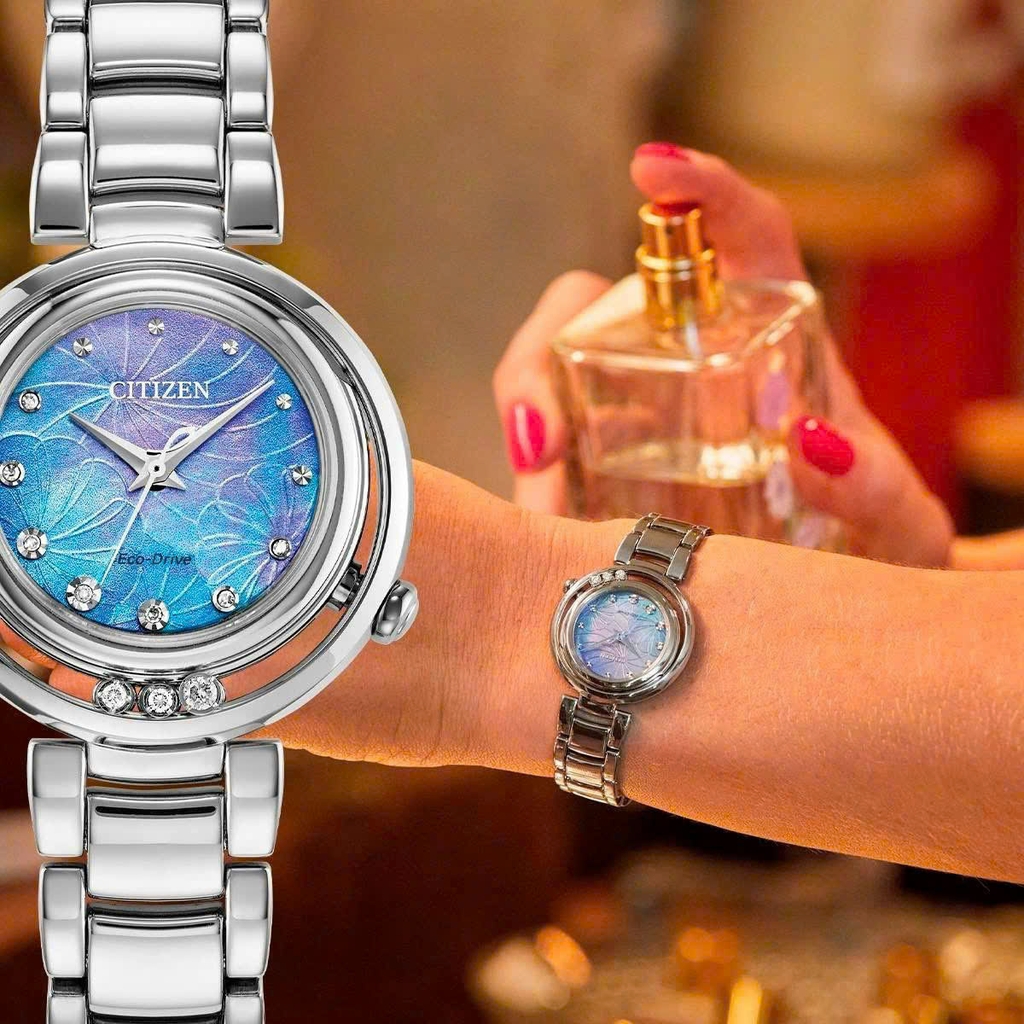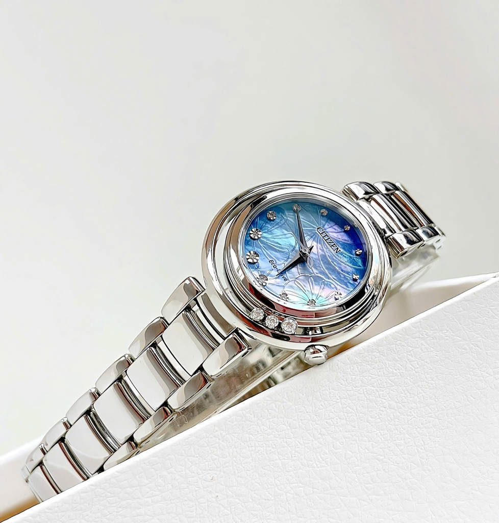 Citizen EM1110-81N tựa như một viên ngọc trai lấp lánh giữa đại dương xanh thẳm. Mặt số xà cừ ánh lên sắc xanh tím huyền ảo, lung linh như làn sóng nhẹ dưới ánh hoàng hôn, kết hợp cùng những họa tiết hoa văn mờ ẩn như cánh gió cuốn. Các viên đá nhỏ được đính khéo léo tại các vị trí cọc số, lấp lánh như những ngôi sao đêm rơi xuống làn nước. Ba viên đá xoay tự do ở đáy mặt số tạo nên chuyển động tinh tế, gợi lên hình ảnh của những giọt sương lăn nhẹ trên cánh hoa.