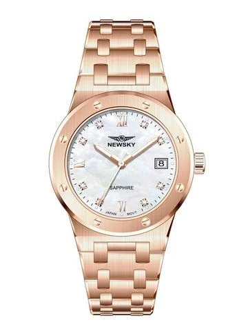 Chiếc đồng hồ NEWSKY NS5024L.S05 là mẫu đồng hồ nữ với phong cách sang trọng. Mặt đồng hồ được khảm xà cừ trắng sang trọng kết hợp cùng cọc số đính đá nổi bật. Các chi tiết trên mặt đồng hồ được sắp xếp cân đối, với kim chỉ và các cọc số thanh mảnh, tạo nên sự trang nhã và tinh tế.