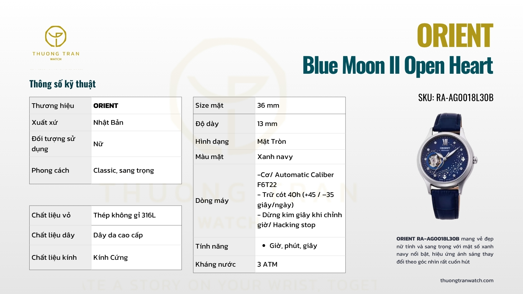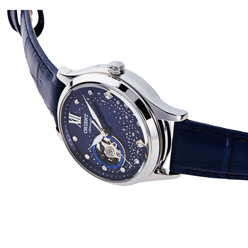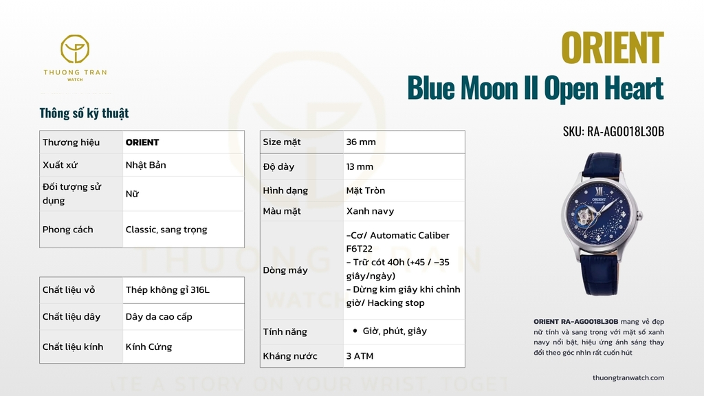 ORIENT RA-AG0018L30B mang vẻ đẹp nữ tính và sang trọng với mặt số xanh navy nổi bật, hiệu ứng ánh sáng thay đổi theo góc nhìn rất cuốn hút. Điểm nhấn open-heart lộ cơ tạo cảm giác cao cấp và tinh xảo, giúp mẫu đồng hồ trở nên khác biệt hơn hẳn khi đeo trên tay. Dáng vỏ 36mm nhỏ gọn, dây da xanh ton-sur-ton thanh lịch, cực kỳ dễ phối đồ từ đi làm đến đi chơi. Sử dụng bộ máy cơ bền bỉ, trữ cót khoảng 40 giờ, RA-AG0018L30B là lựa chọn hoàn hảo cho chị em yêu sự nhẹ nhàng, sang và tinh tế.