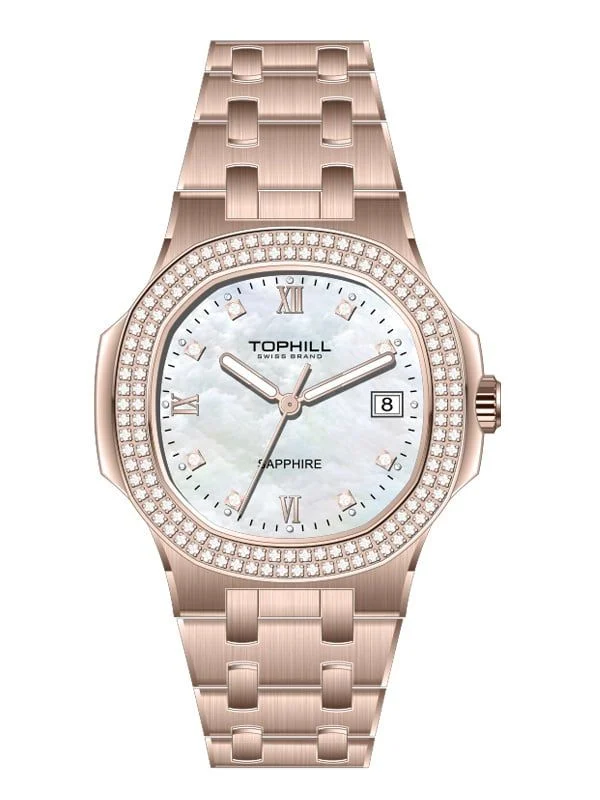 Chiếc đồng Tophill TL029L.M3262 là mẫu đồng hồ nữ với phong cách sang trọng. Mặt đồng hồ khảm xà cừ trắng tinh tế, tạo chiều sâu và điểm nhấn ấn tượng cho tổng thể thiết kế. Viền mặt số được đính hai hàng đá pha lê lấp lánh, giúp tăng thêm vẻ quyến rũ và sang trọng cho sản phẩm. Các cọc số dạng kim cương kết hợp với số La Mã tại vị trí 12, 6 và 9 giờ, mang phong cách cổ điển pha hiện đại. Chiếc đồng hồ này phù hợp cho những ai yêu thích vẻ đẹp thanh lịch, thời thượng và sự bền bỉ của đồng hồ Thụy Sĩ.