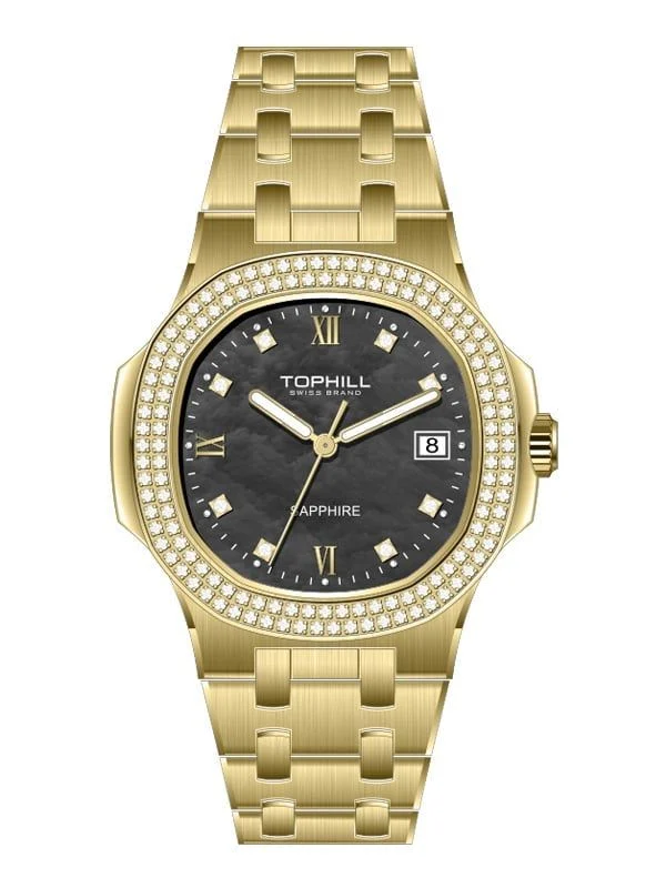 Chiếc đồng Tophill TL029L.M2162 là mẫu đồng hồ nữ với phong cách sang trọng. Mặt đồng hồ khảm xà cừ đen tinh tế, tạo chiều sâu và điểm nhấn ấn tượng cho tổng thể thiết kế. Viền mặt số được đính hai hàng đá pha lê lấp lánh, giúp tăng thêm vẻ quyến rũ và sang trọng cho sản phẩm. Các cọc số dạng kim cương kết hợp với số La Mã tại vị trí 12, 6 và 9 giờ, mang phong cách cổ điển pha hiện đại. Chiếc đồng hồ này phù hợp cho những ai yêu thích vẻ đẹp thanh lịch, thời thượng và sự bền bỉ của đồng hồ Thụy Sĩ.
