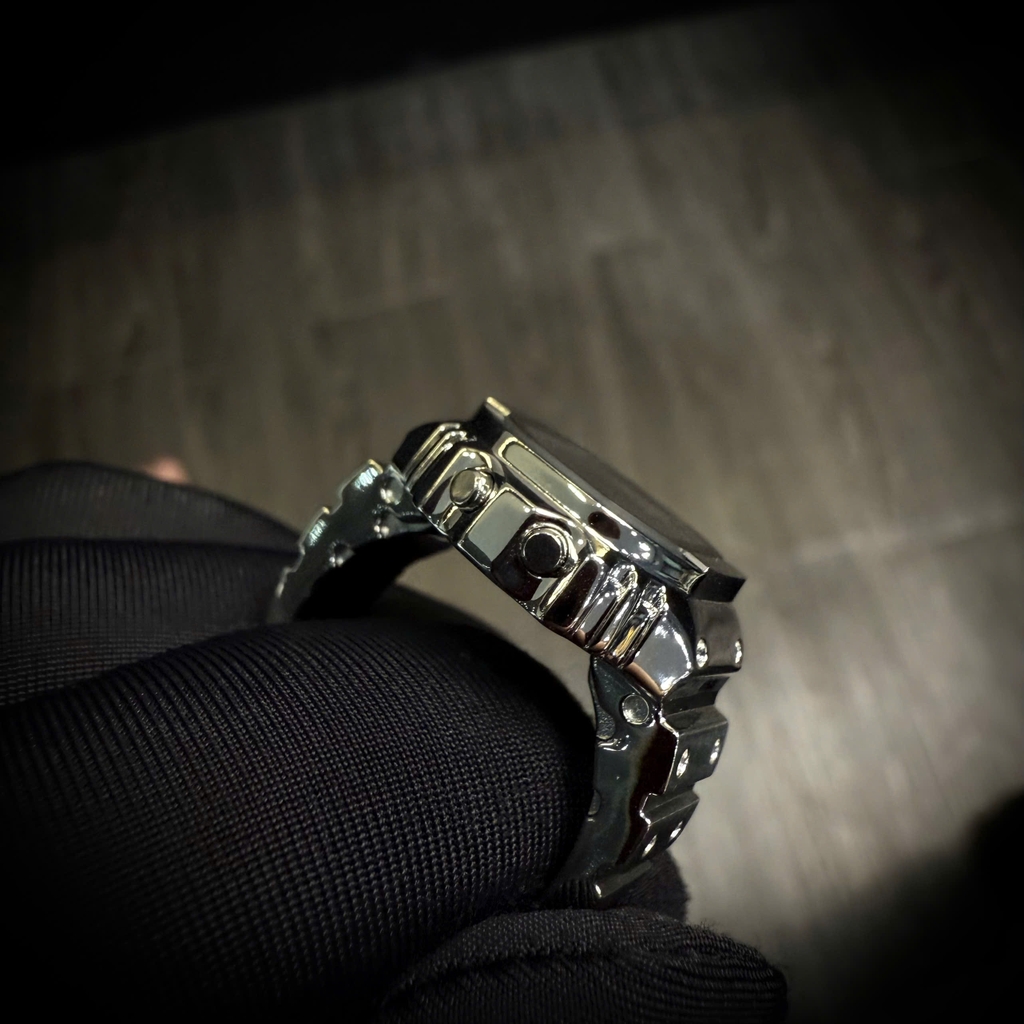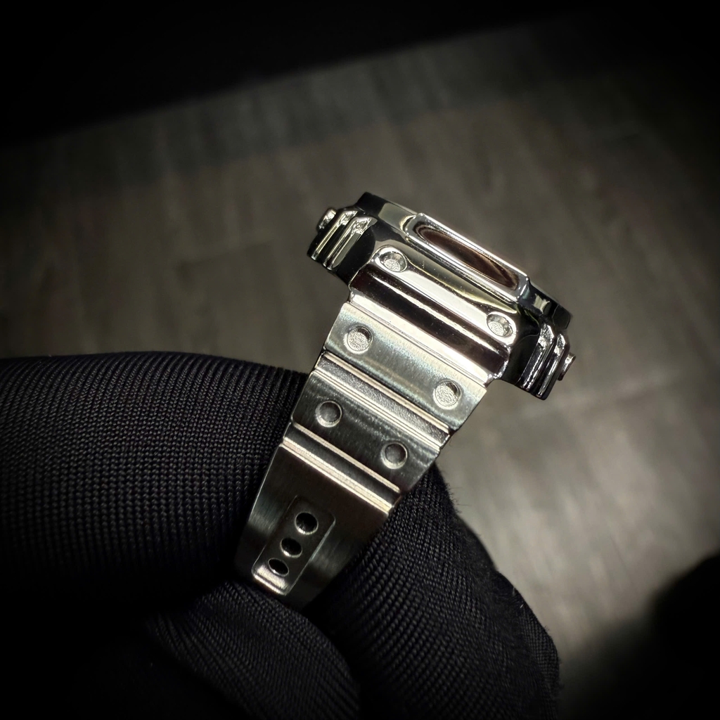 Mang kiểu dáng biểu tượng của dòng G-Shock huyền thoại, sản phẩm tạo nên điểm nhấn cá tính với lớp vỏ kim loại sáng bóng, màn hình LED hiển thị giờ số rõ nét, cùng các nút bấm mô phỏng như đồng hồ thật.